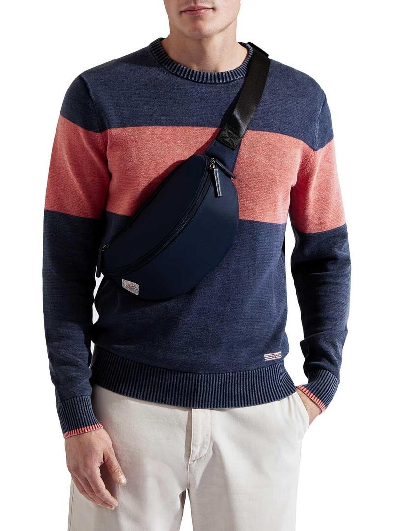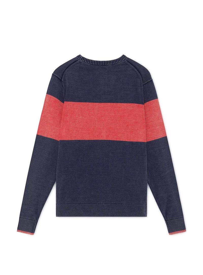 Camisola Hackett. Modelo Block Stripe. Cor azul marinho. Faixa de coral. Slim fit. Pescoço redondo. Extremidades com nervuras. Logotipo metálico na bainha.