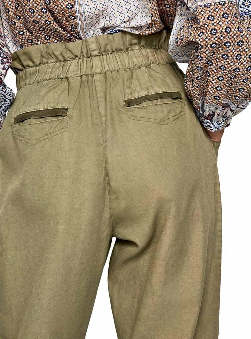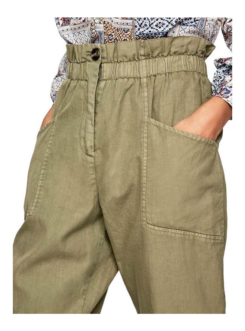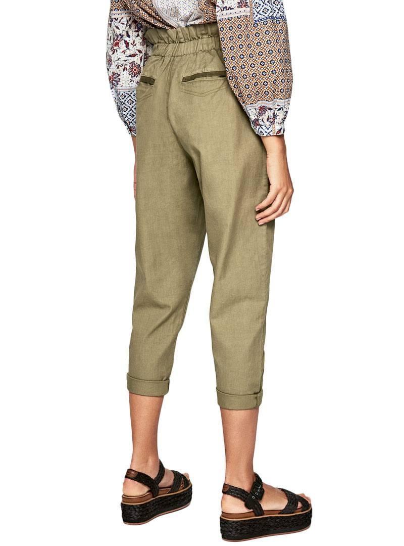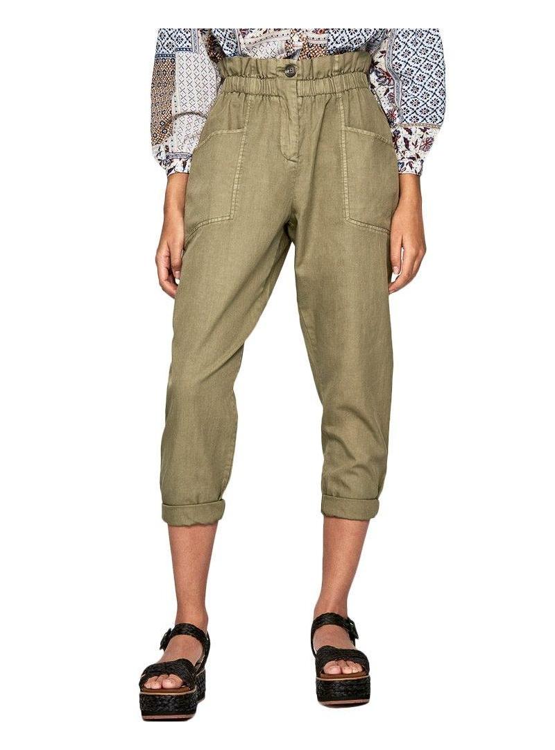 Calças Pepe Jeans. Modelo Lia. Cor verde. High rise. Cintura elástica. Dois bolsos laterais. Dois bolsos traseiros. Estilo pescador. Ajuste solto.