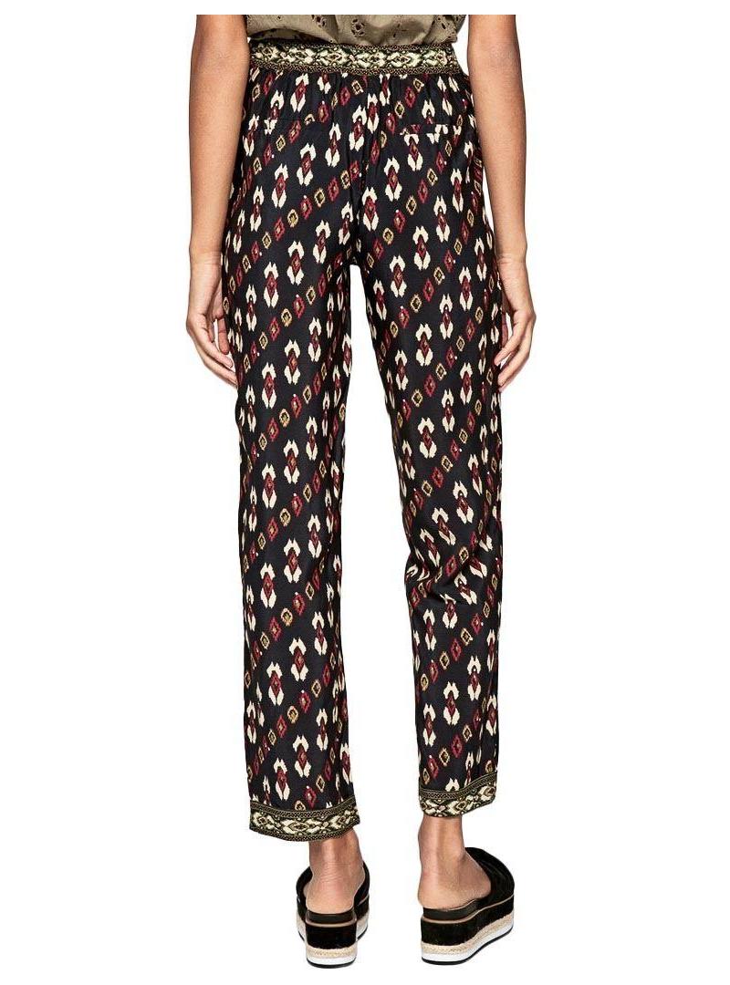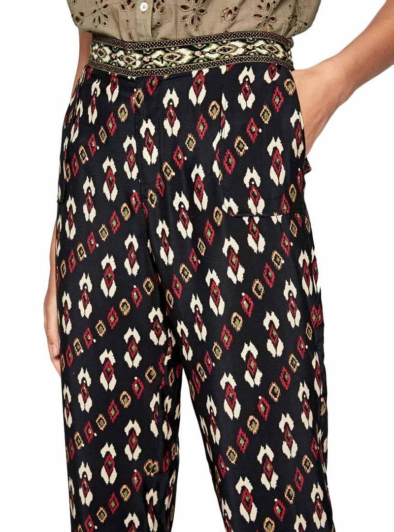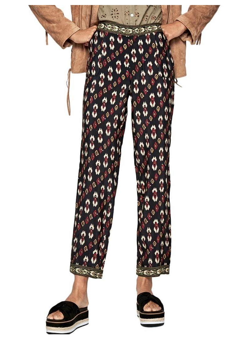 Calças Pepe Jeans. Modelo Kelly. Cor preta. High rise. Impressão étnica. Corte reto. Dois bolsos laterais. Borda nas extremidades. Cintura elástica.