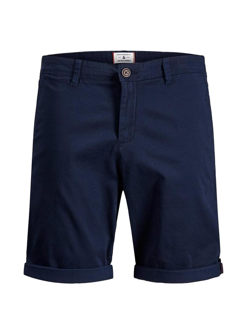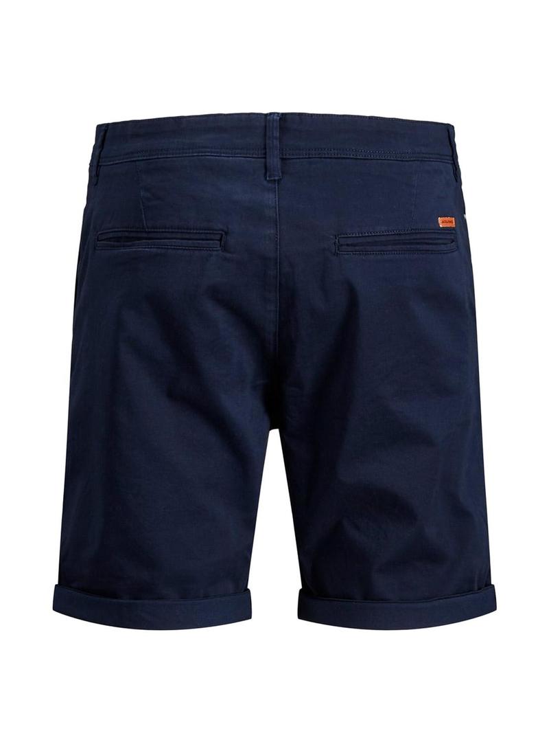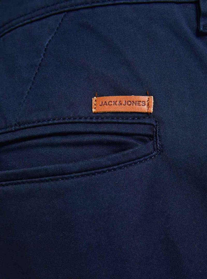 Bermuda Jack and Jones. Modelo Bowie. Cor da Marinha. Dois bolsos laterais. Dois bolsos traseiros. Estilo chino. Remendo de marca de couro.