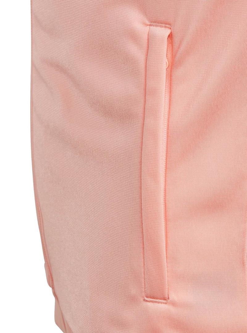 Casaca de fato de treino. Marca Adidas. Modelo tracktop. Coral e cor branca. Fecho com zíper. Gola, punhos e bainha nervurada. Bolsos laterais com fecho. Corte clássico. 3 faixas brancas nos braços.