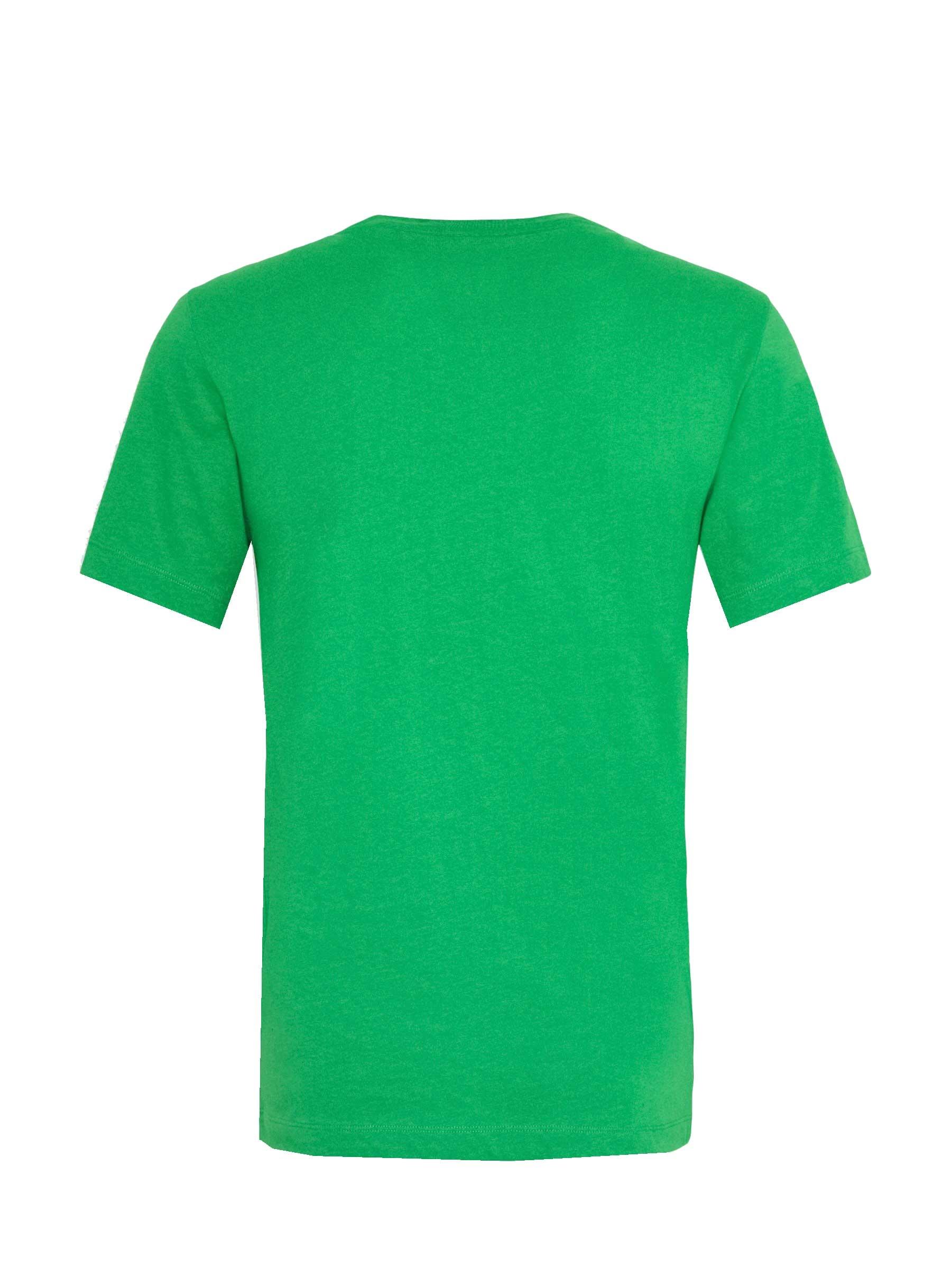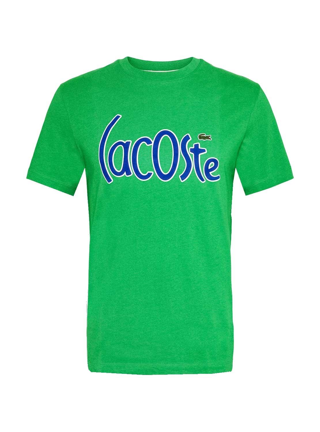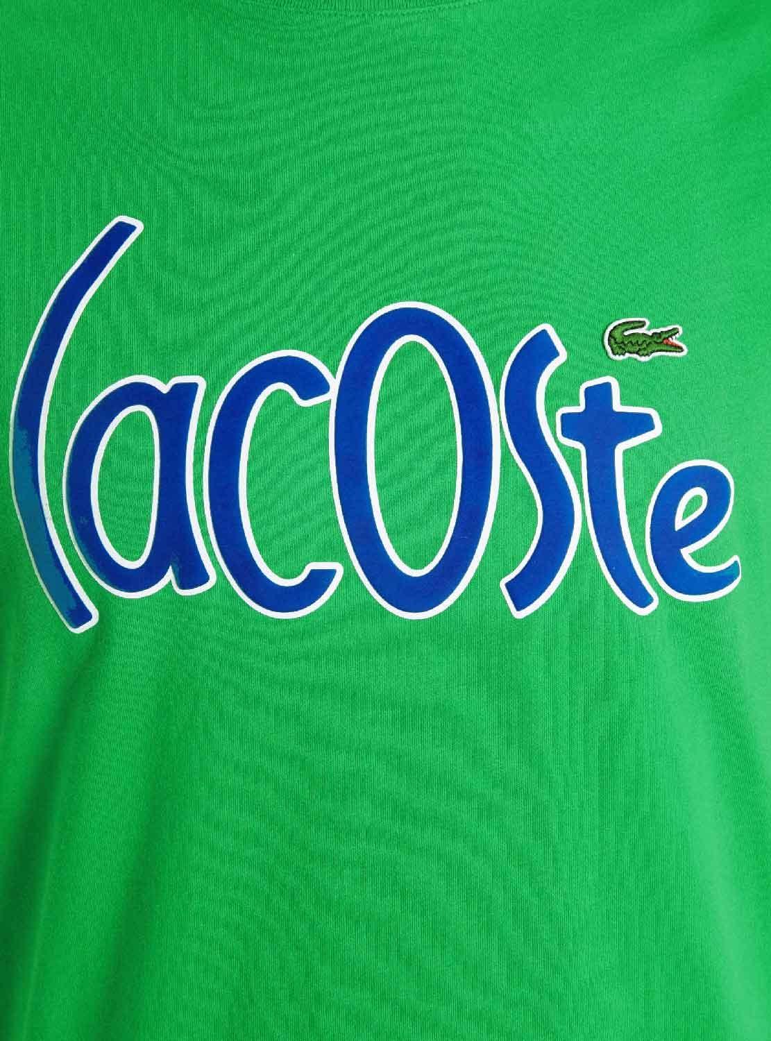 T-Shirt Lacoste. Logotipo de grandes dimensões no peito. Cor verde. Detalhes em azul. Manga curta. Regular fit. Gola redonda elástica.