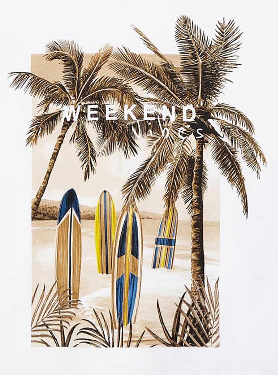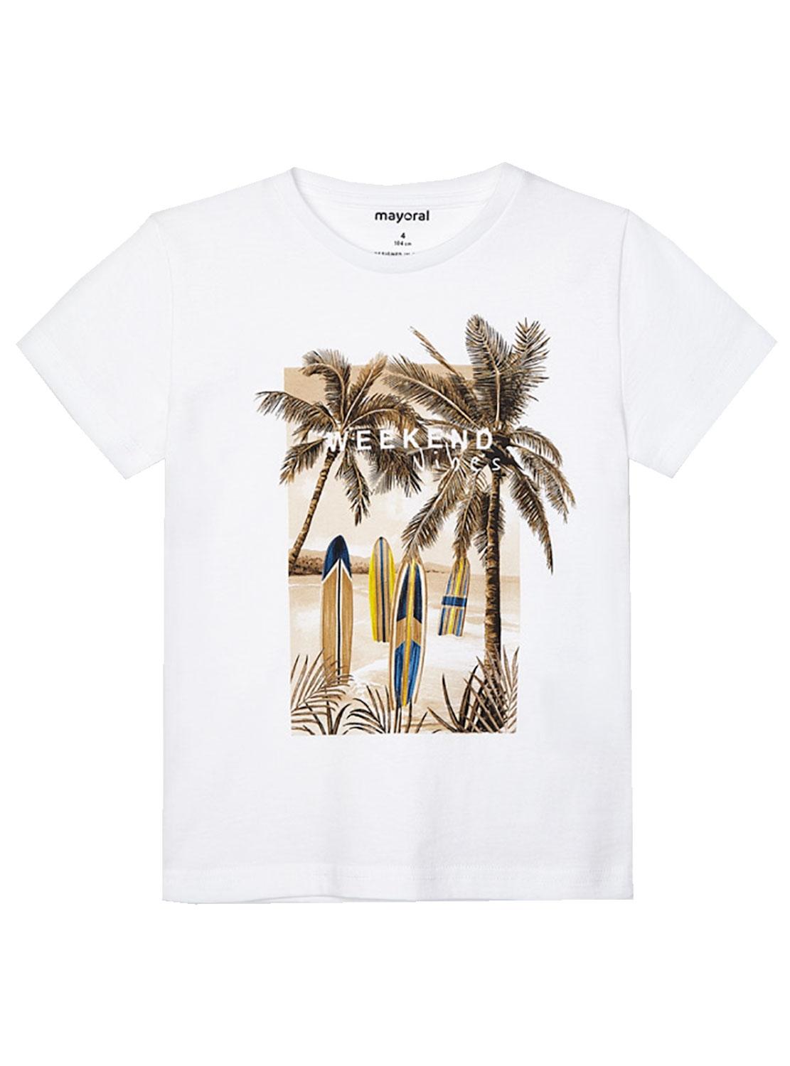 T-Shirt Mayoral. Modelo Weekend Vibes. Cor branca. Manga curta. Tecido de algodão sustentável. Desenho de palmeiras carimbadas.