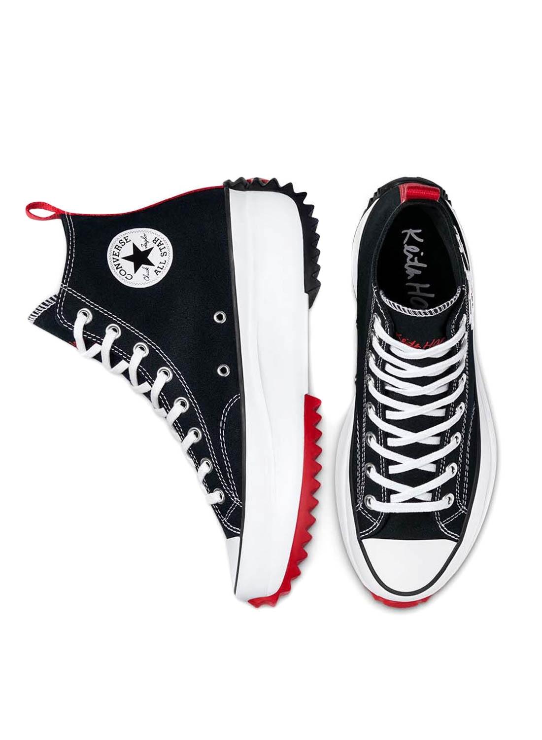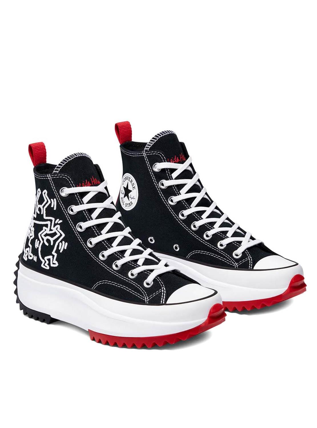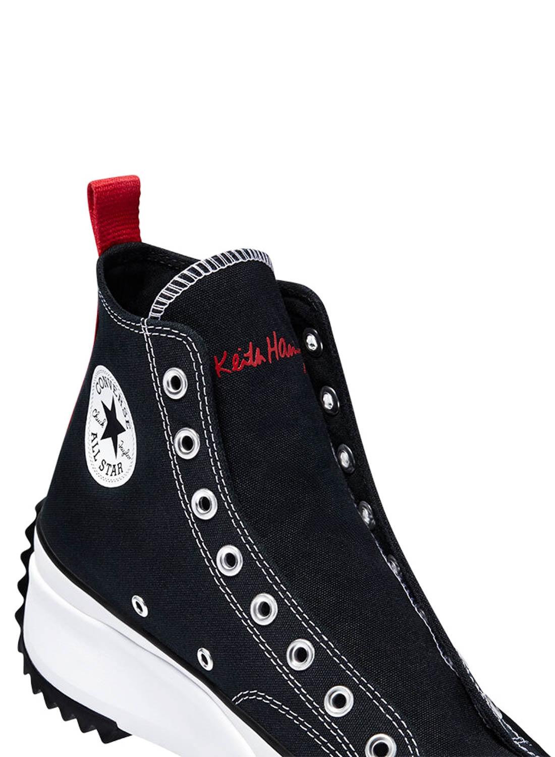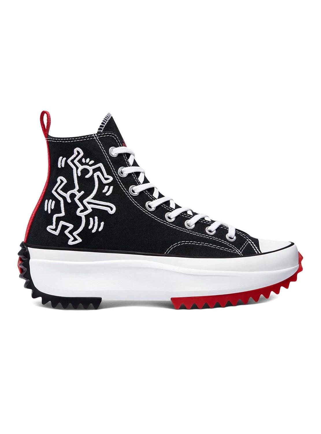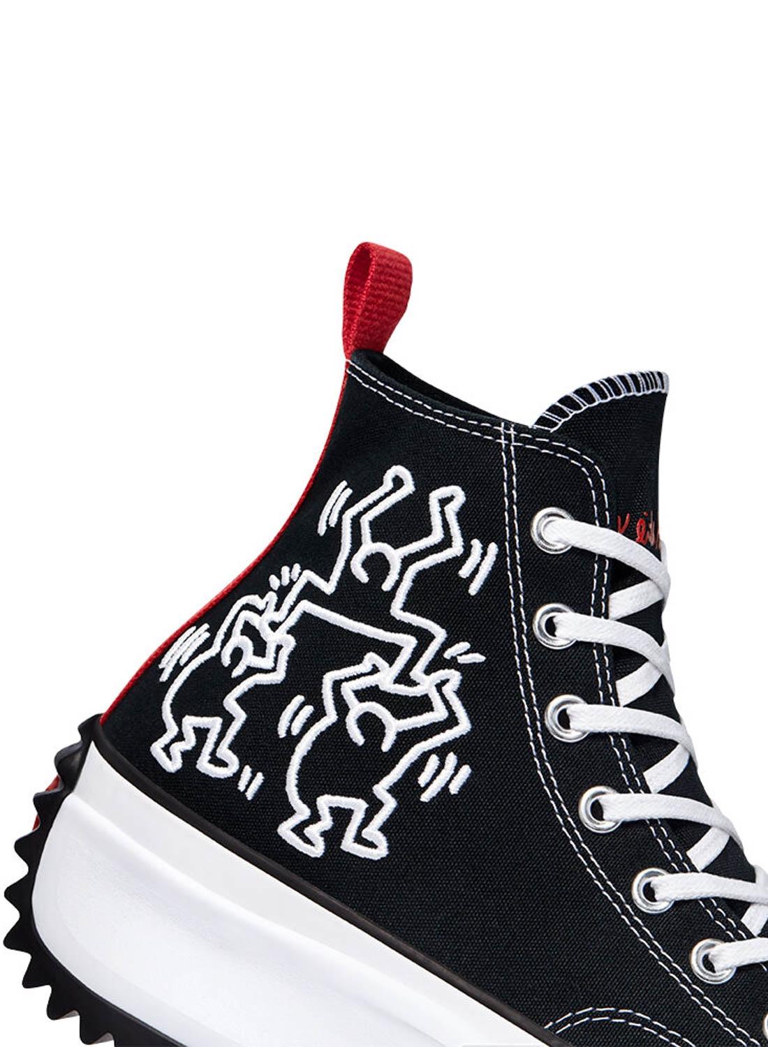 Sapatilhas Converse. Modelo x Keith Run Star Hike. para Mulher. High Top. Cor preta. Fecho com cordões. Parte de cima em tela clássica. Impressão estampada Harring. Sola dente de serra. Sola em bloco de cor. Palmilha Ortholite.