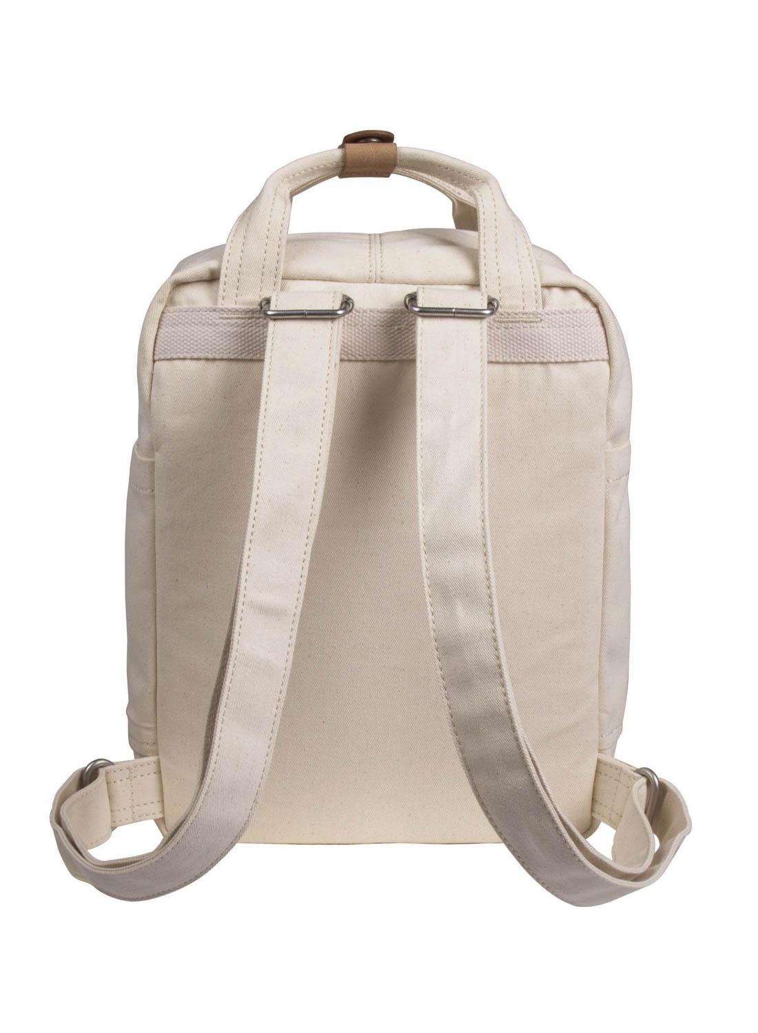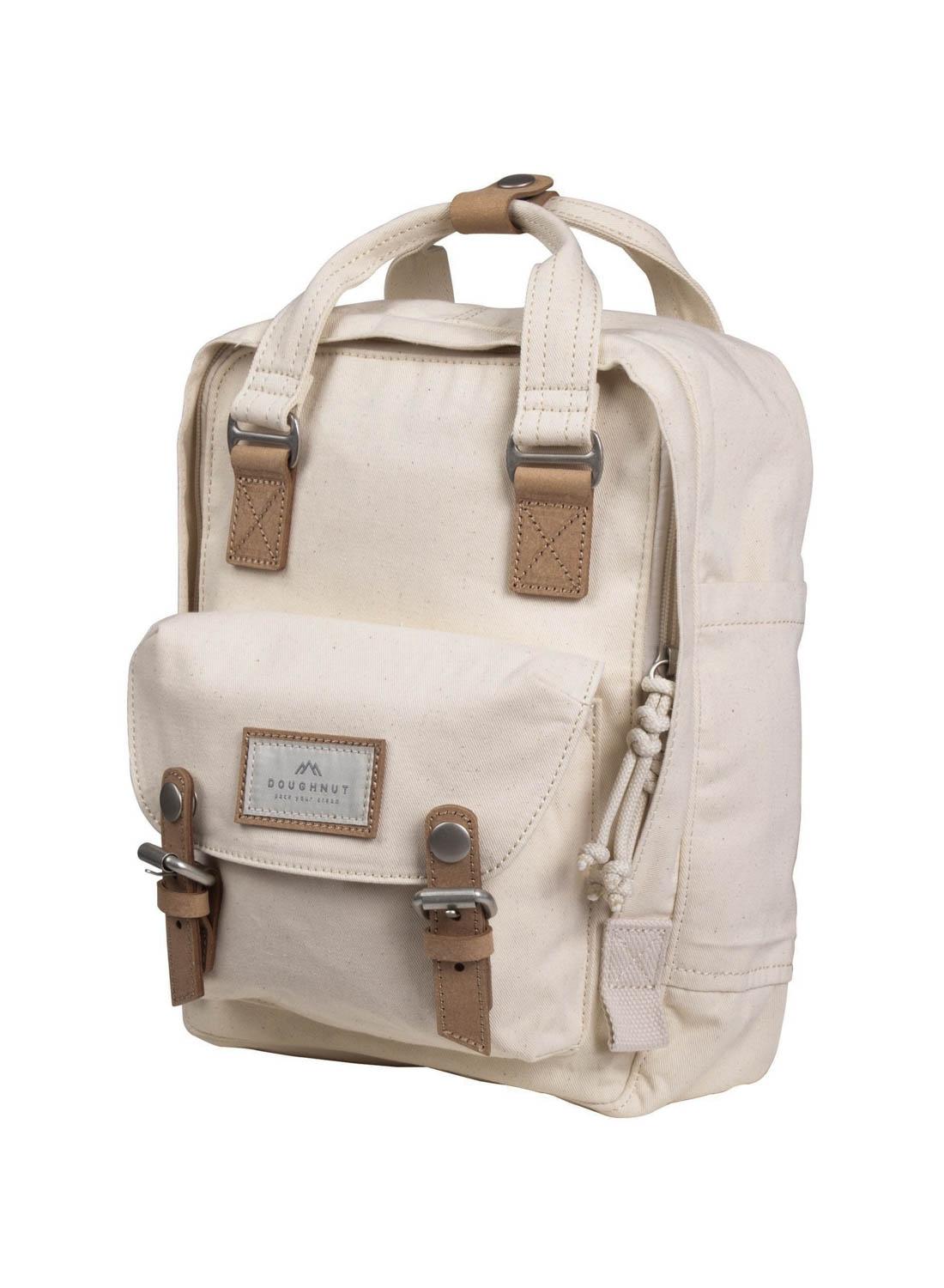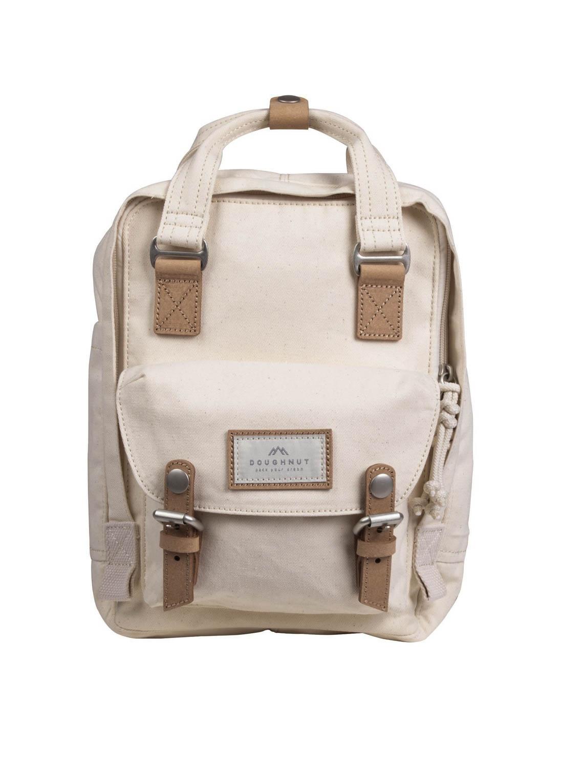 Mochila Doughnut. Modelo Macaroon Mini. Cor bege. Algodão orgânico. Selo GOTS. Alças ajustáveis e acolchoadas. Bolso externo. Alça superior. Compartimentos interiores. Logotipo bordado. Dimensões: 21,5 x 9 x 30 cm. Cape com capacidade de 7L.