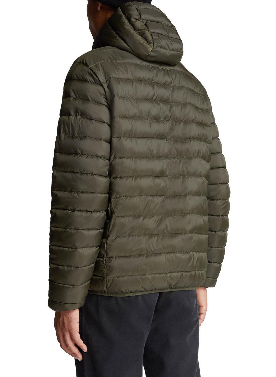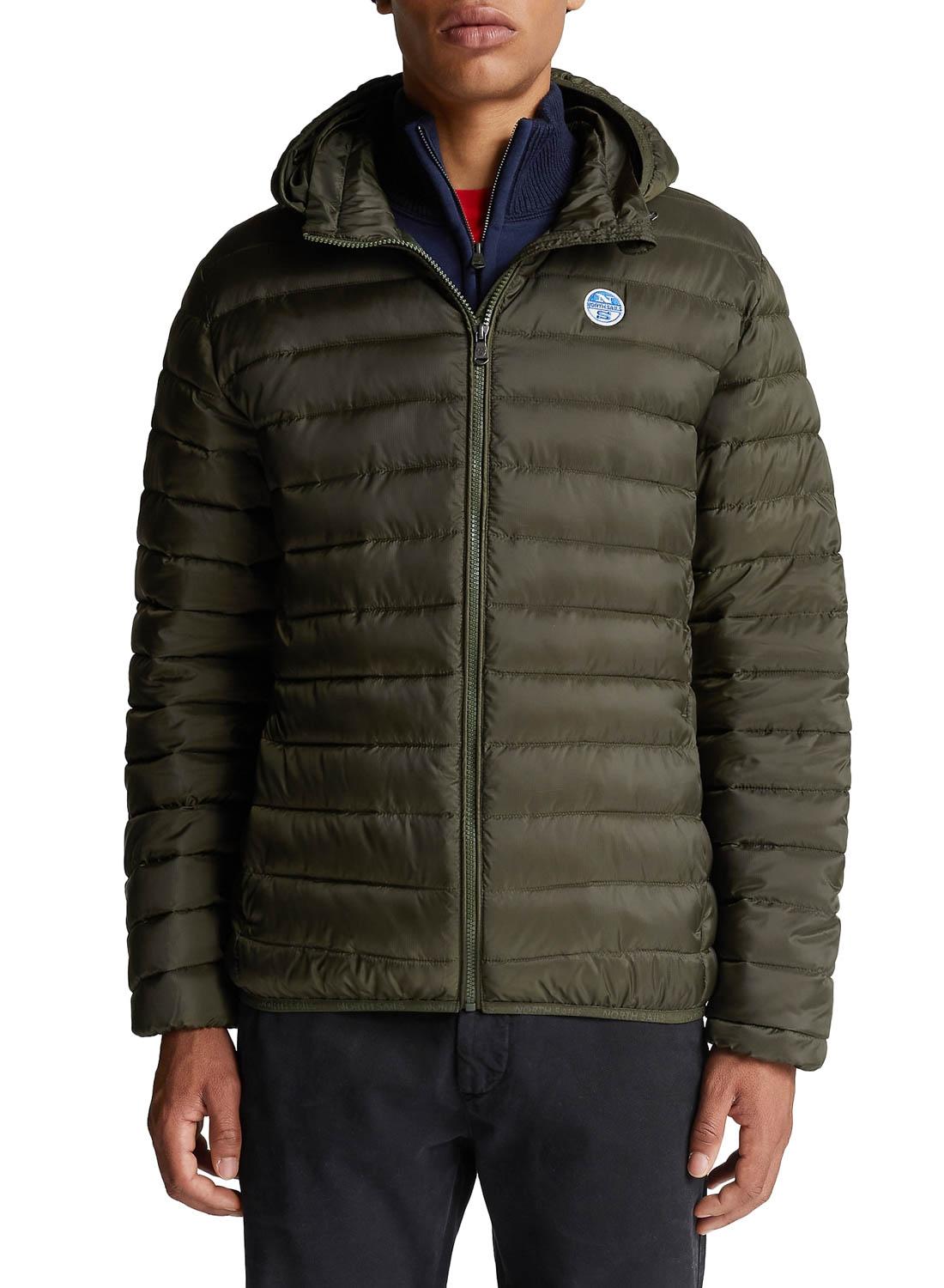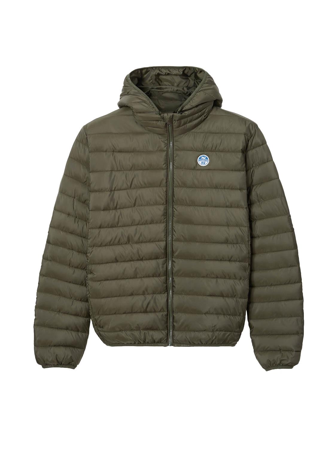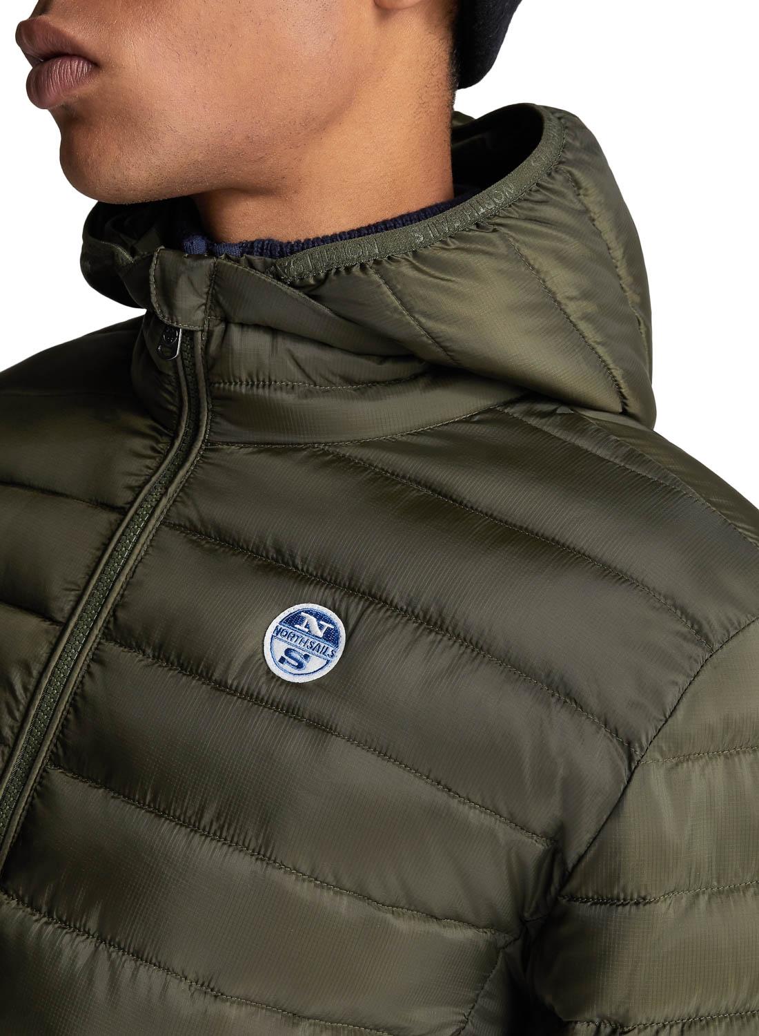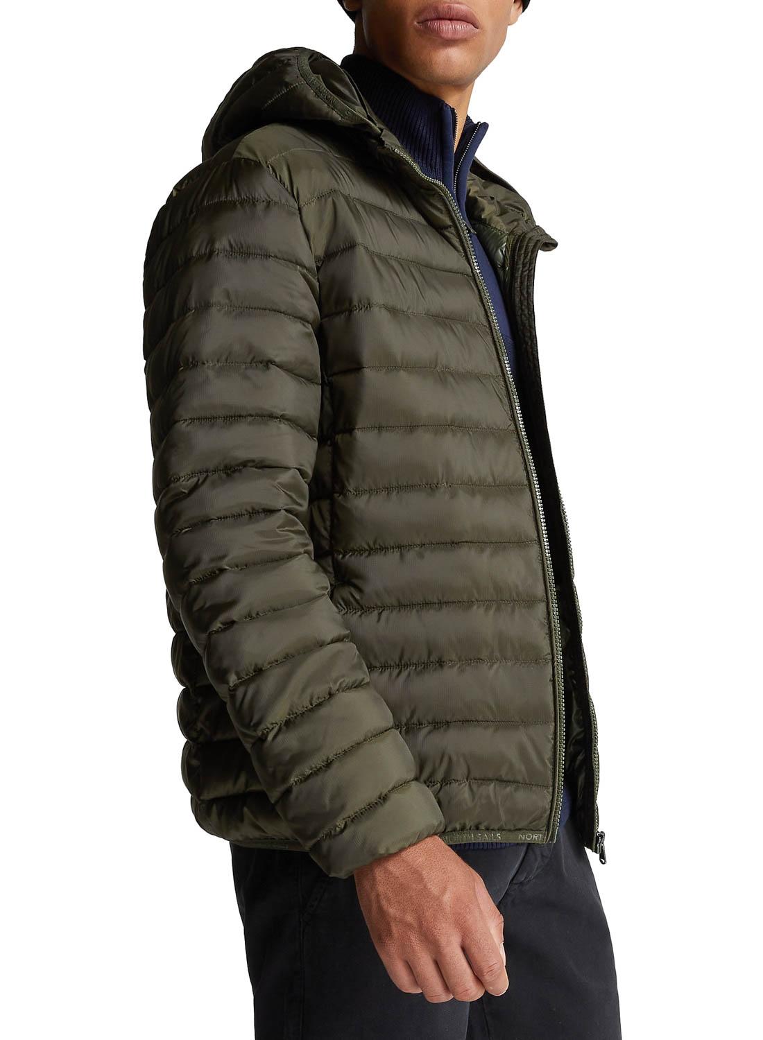 Casaca North Sails. Modelo Skye. Cor verde. Com capuz. Tecido acolchoado. Dois bolsos laterais. Pescoço longo. Regular fit Logotipo circular no peito.