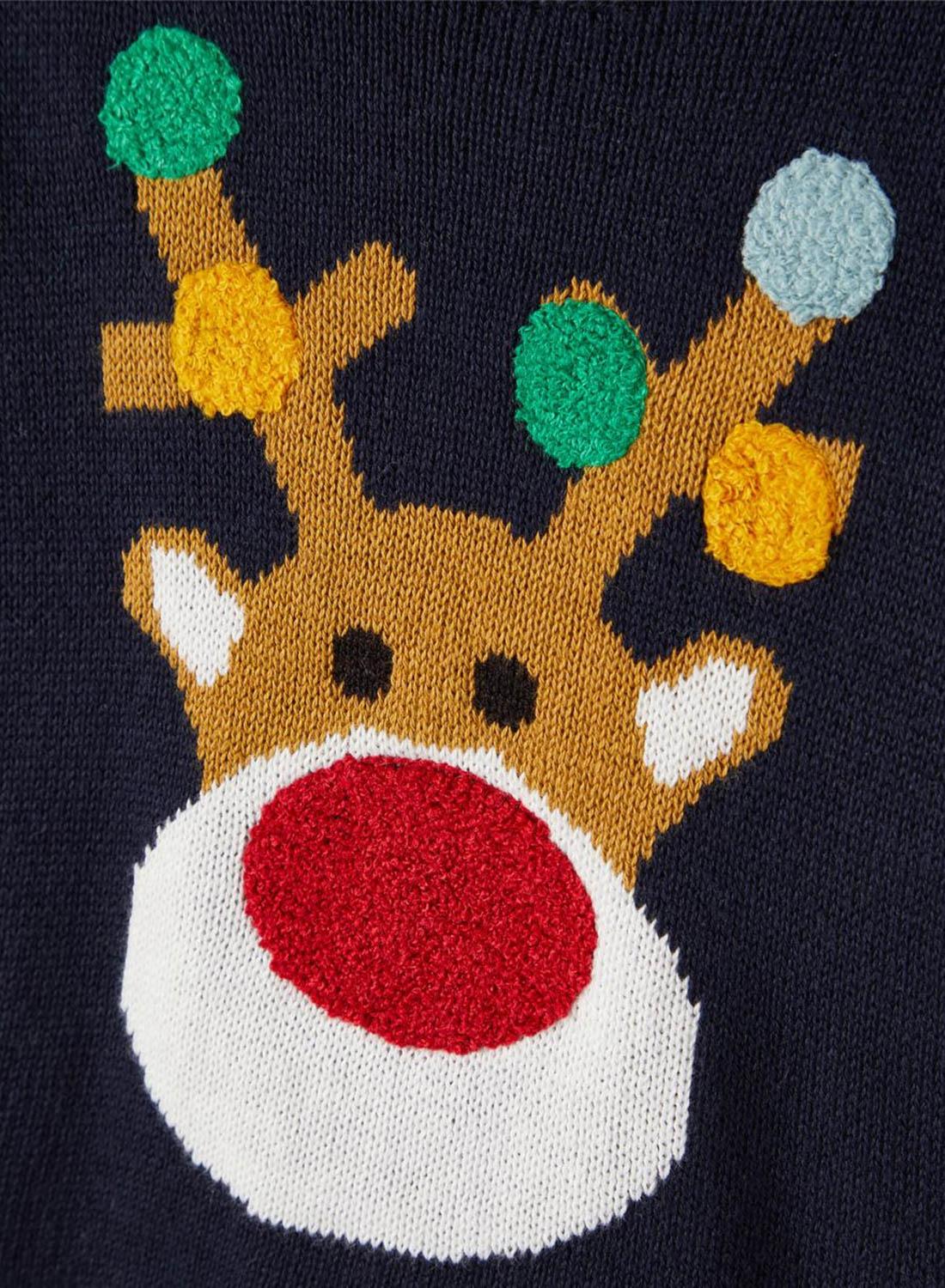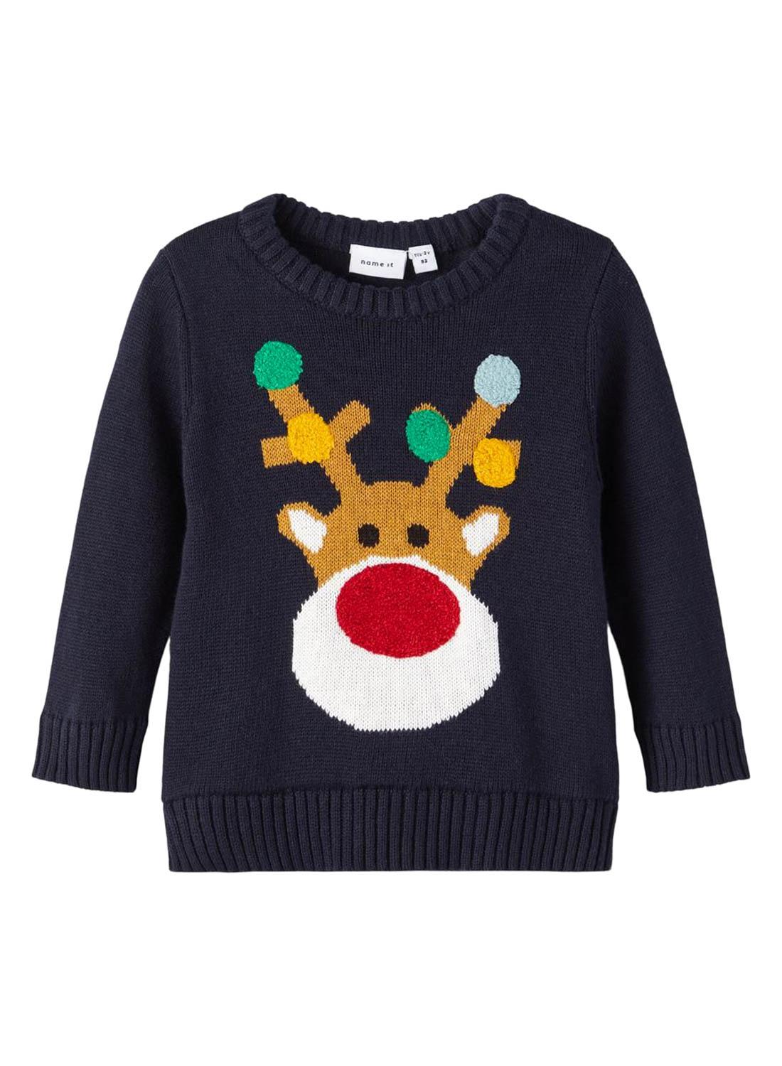 Camisola Name It. Modelo Rakul. Cor marinha. Rena bordada na frente. Manga comprida. Pescoço redondo. Tamanho normal.