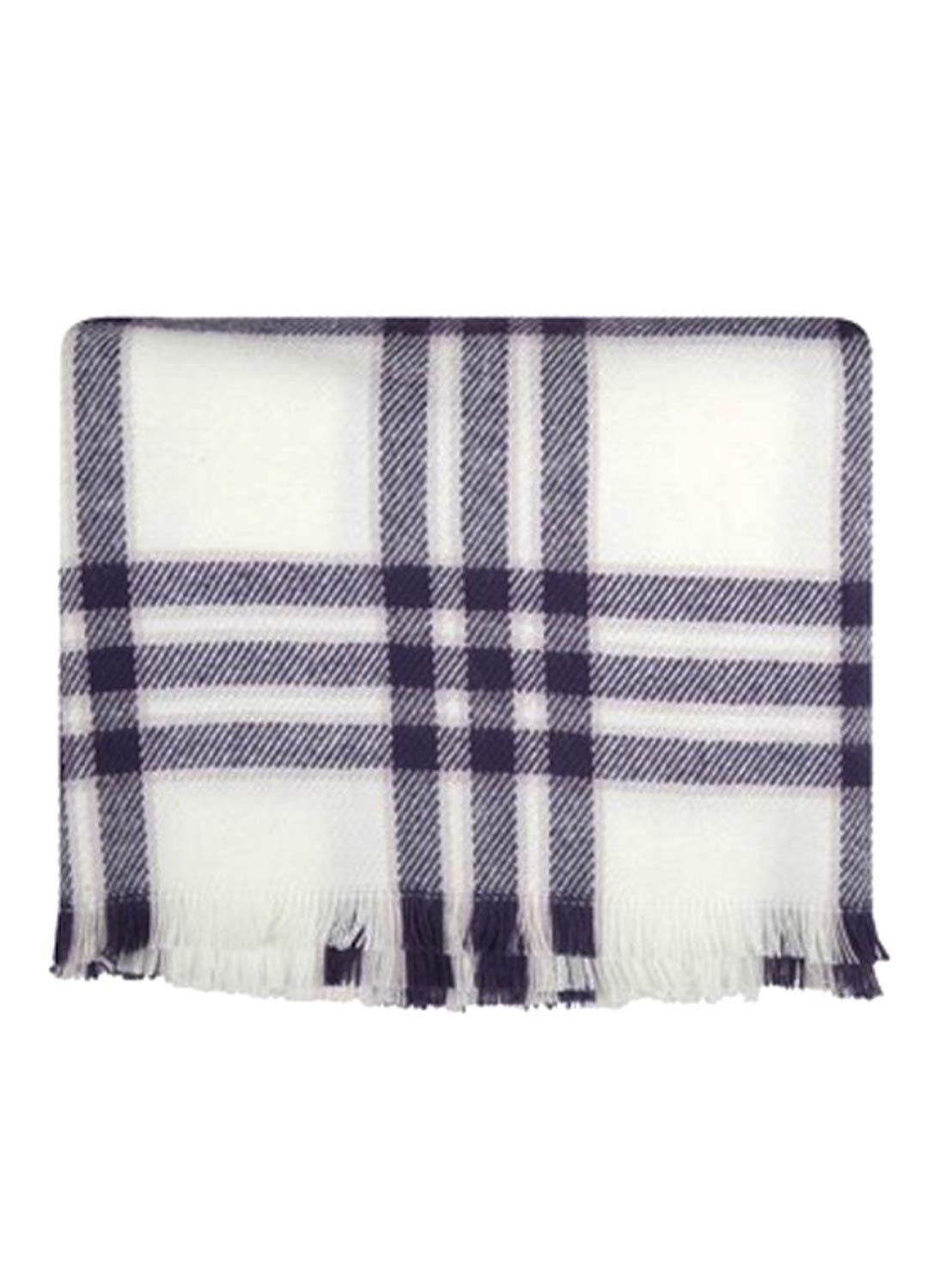 Cachecol Naf Naf. Cor crua e lilás. Impressão quadriculada. Detalhe franjado.