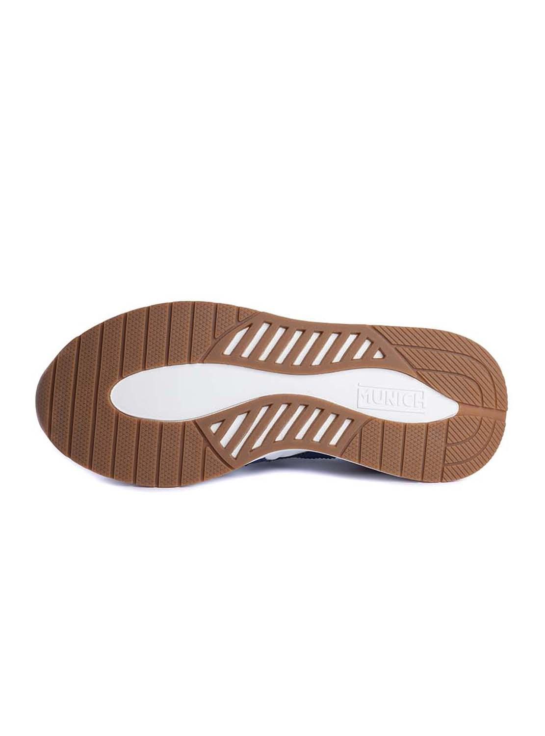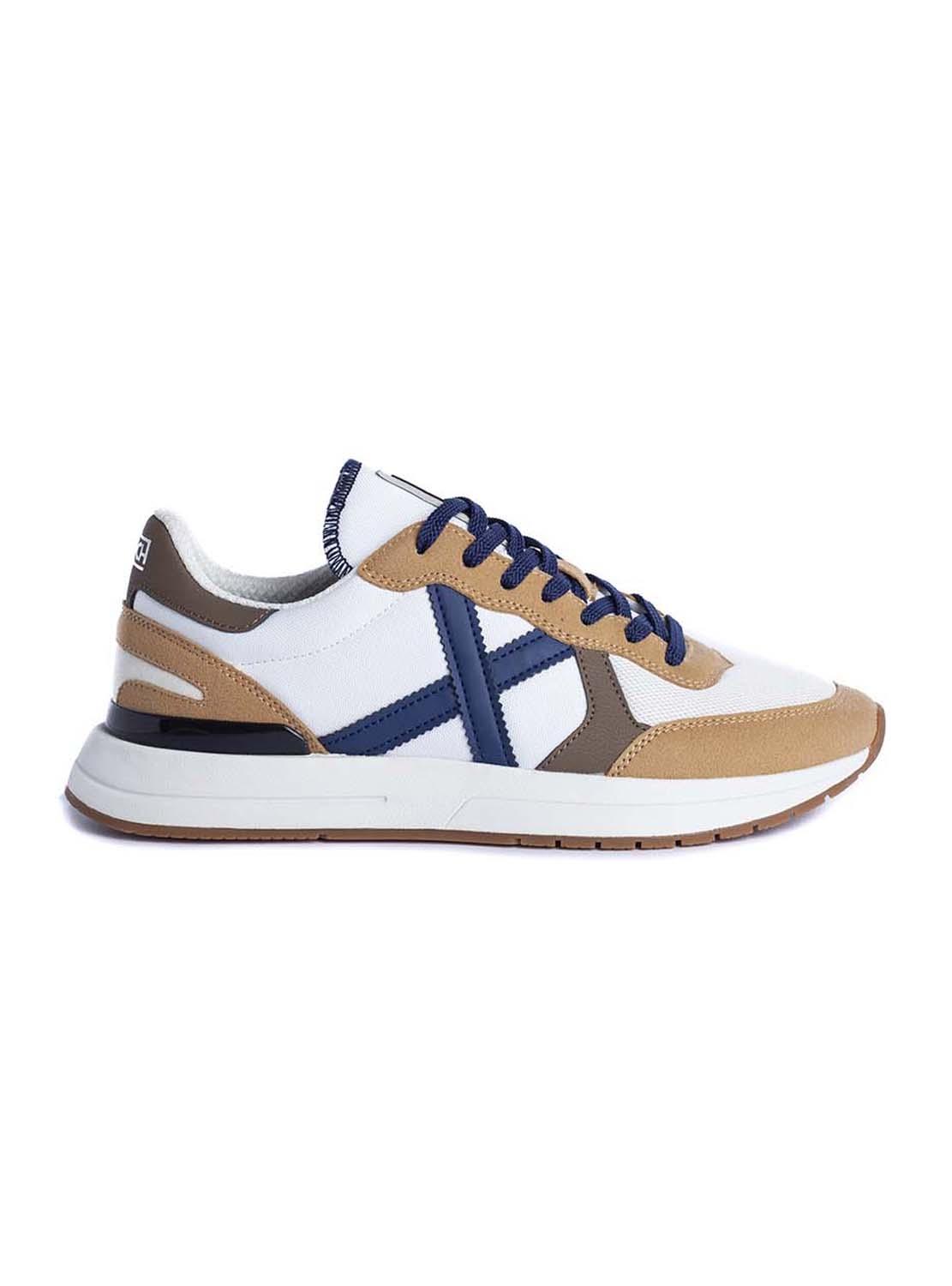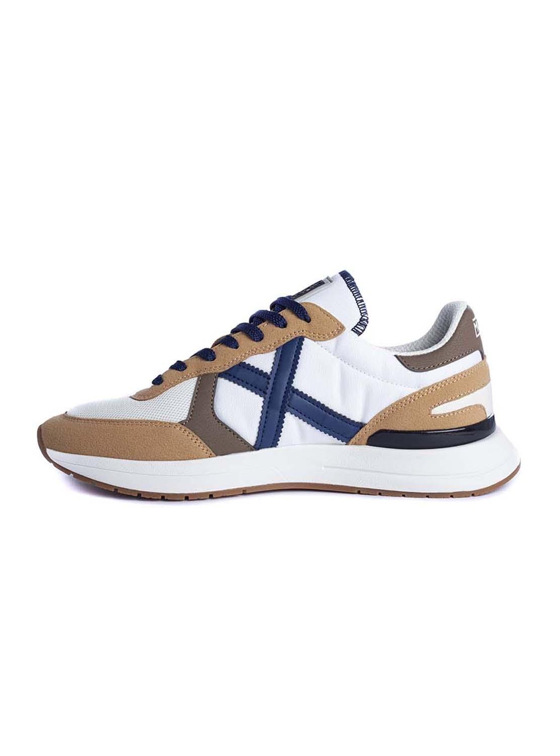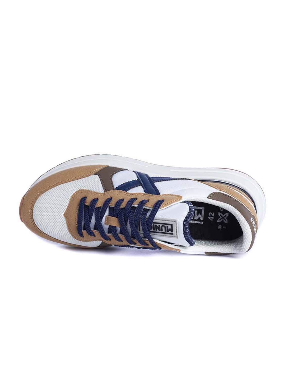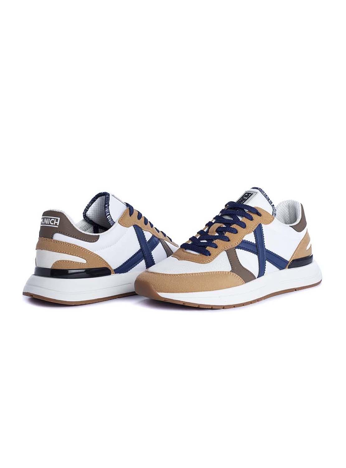 Sapatilhas Munich. Modelo Soon. Cor branca. Detalhes na cor camel e azul. Contraste de materiais. Painéis de camurça. Estabilizador de TPU. Cordonera com sete passados. Entressola em phylon injetado.