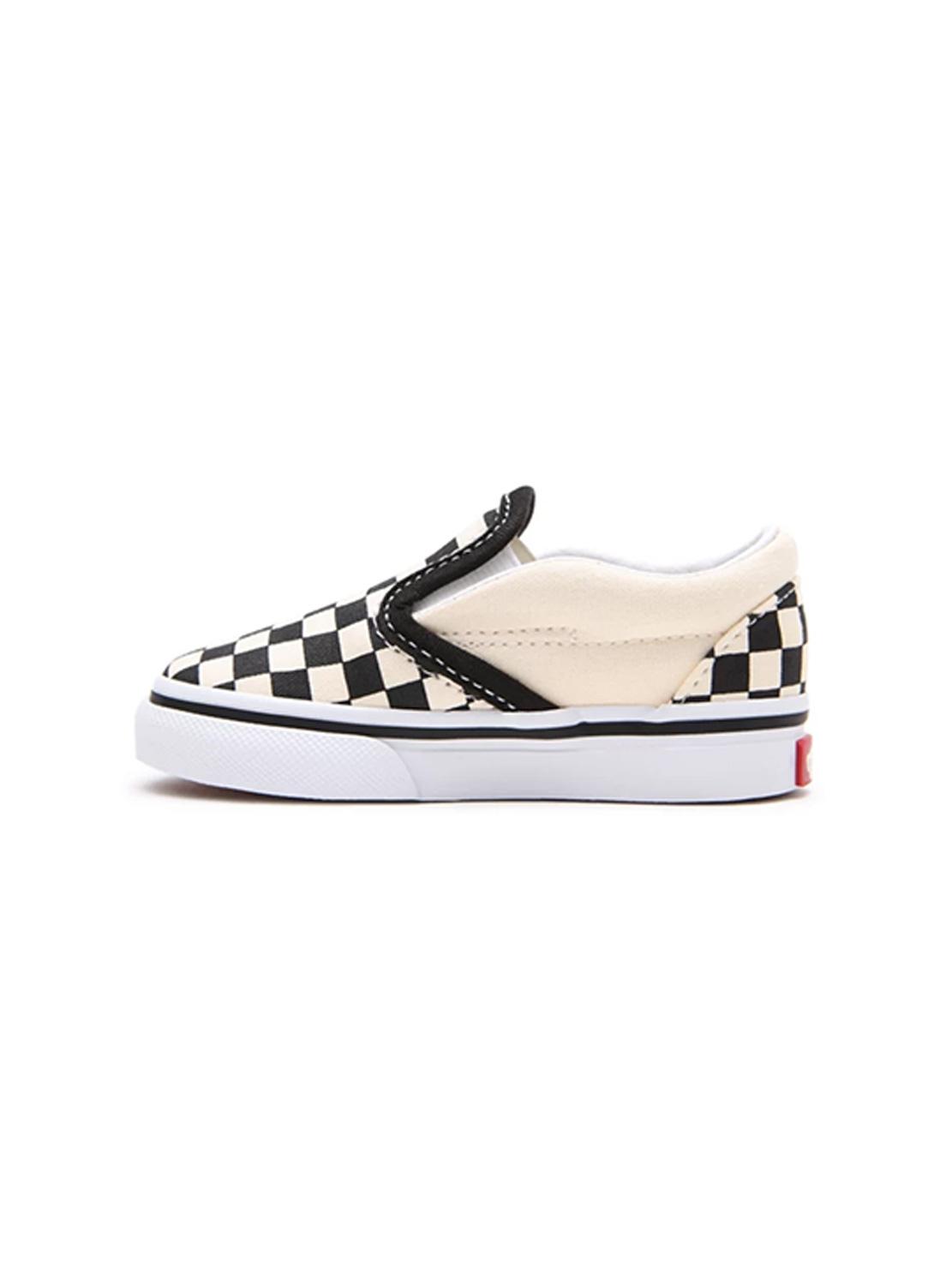 Sapatilhas Vans. Modelo Classic Slip On. Estampa quadriculada em preto e bege. Sem fecho. Etiqueta costurada na lateral. Logo na parte traseira.