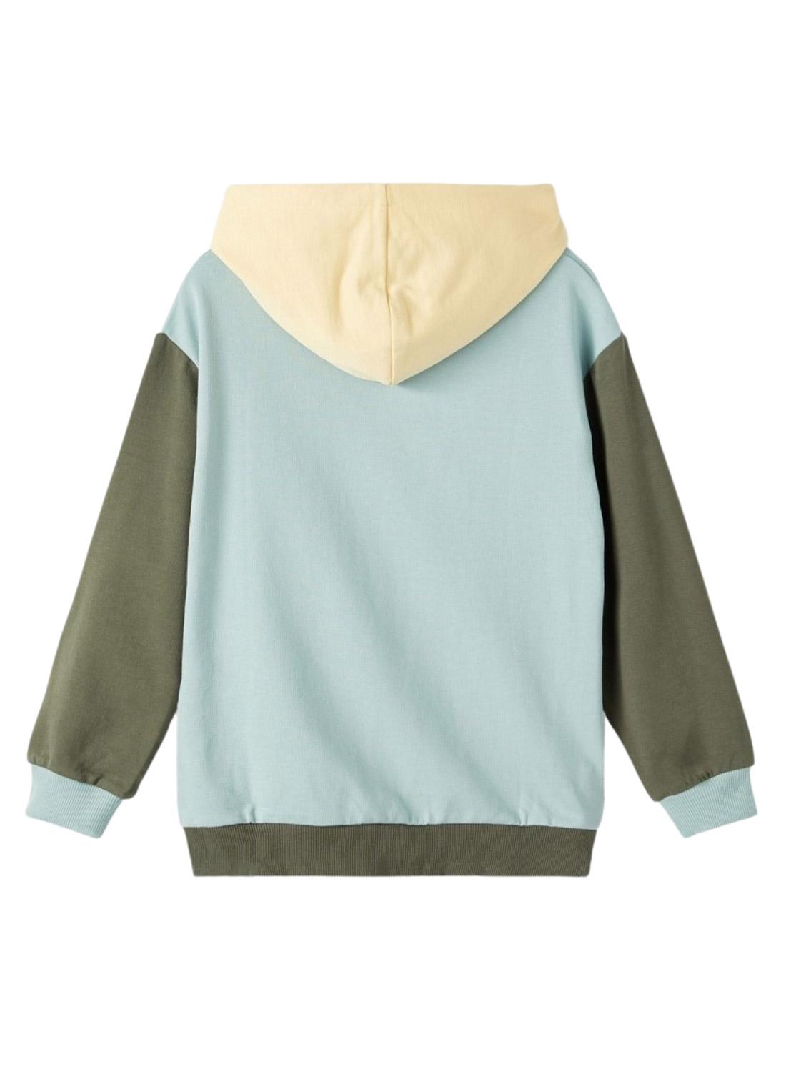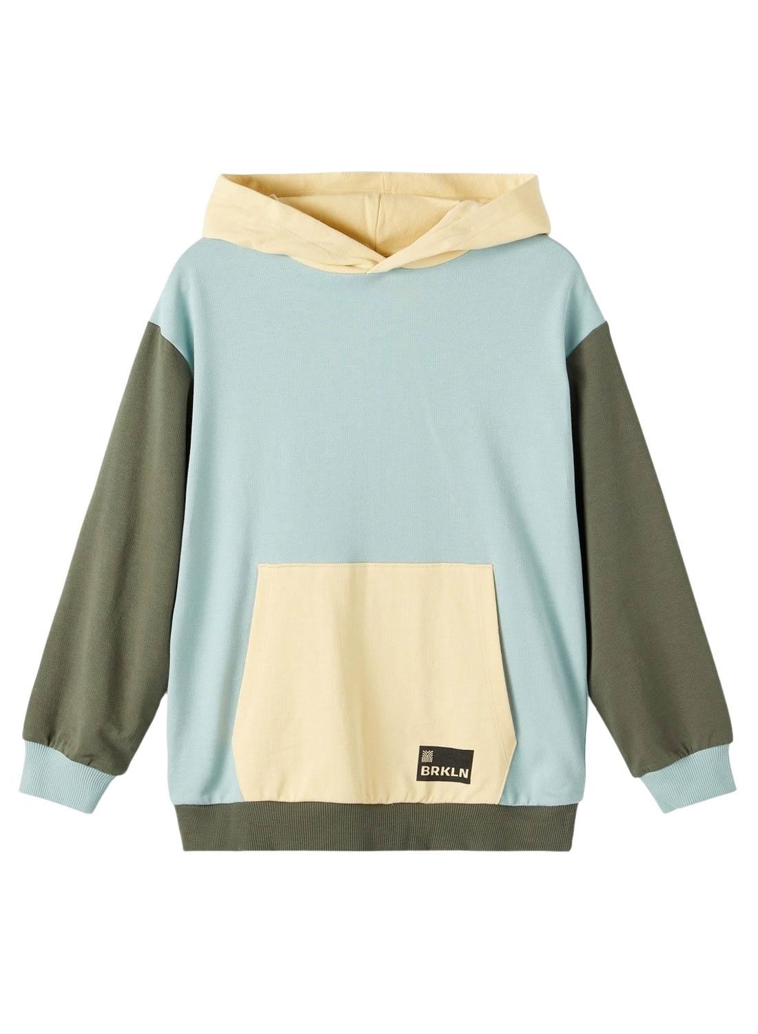 Sweat Name It. Modelo de bloco de cores. Cor azul, verde e amarelo. Com capuz com cordão. Bolso canguru amarelo contrastante. Logo no bolso. Extremidades caneladas.