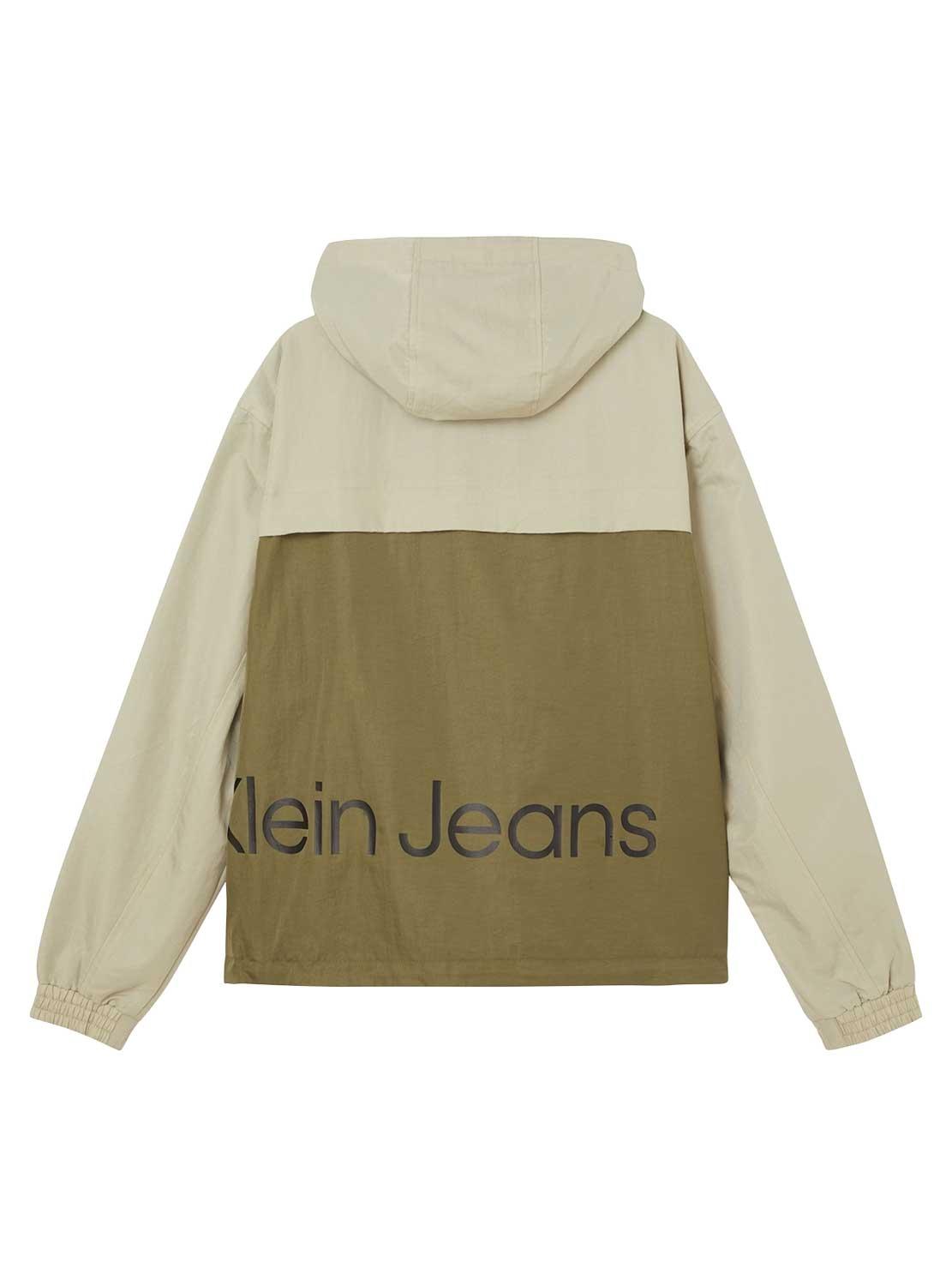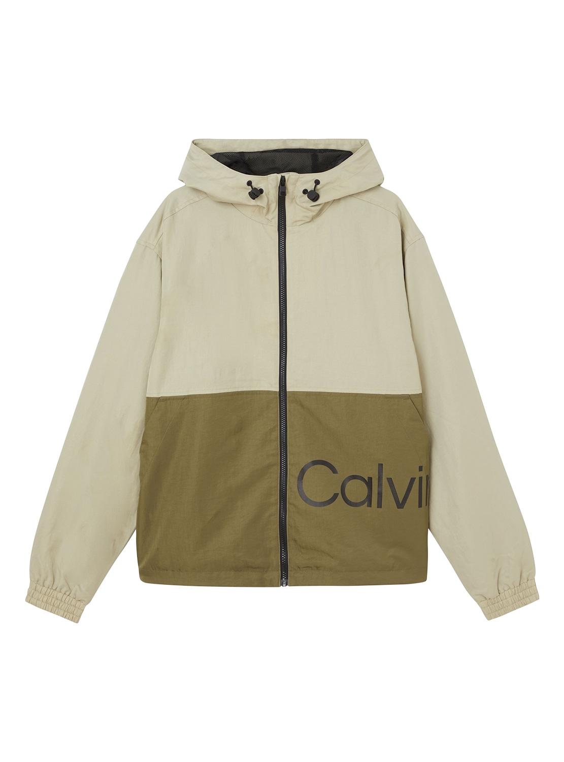 Jaqueta corta-vento Calvin Klein. Colorblock em bege. Modelo Colorblock. Capuz ajustável. Punhos com borracha. Logo oversize na lateral da frente para trás.