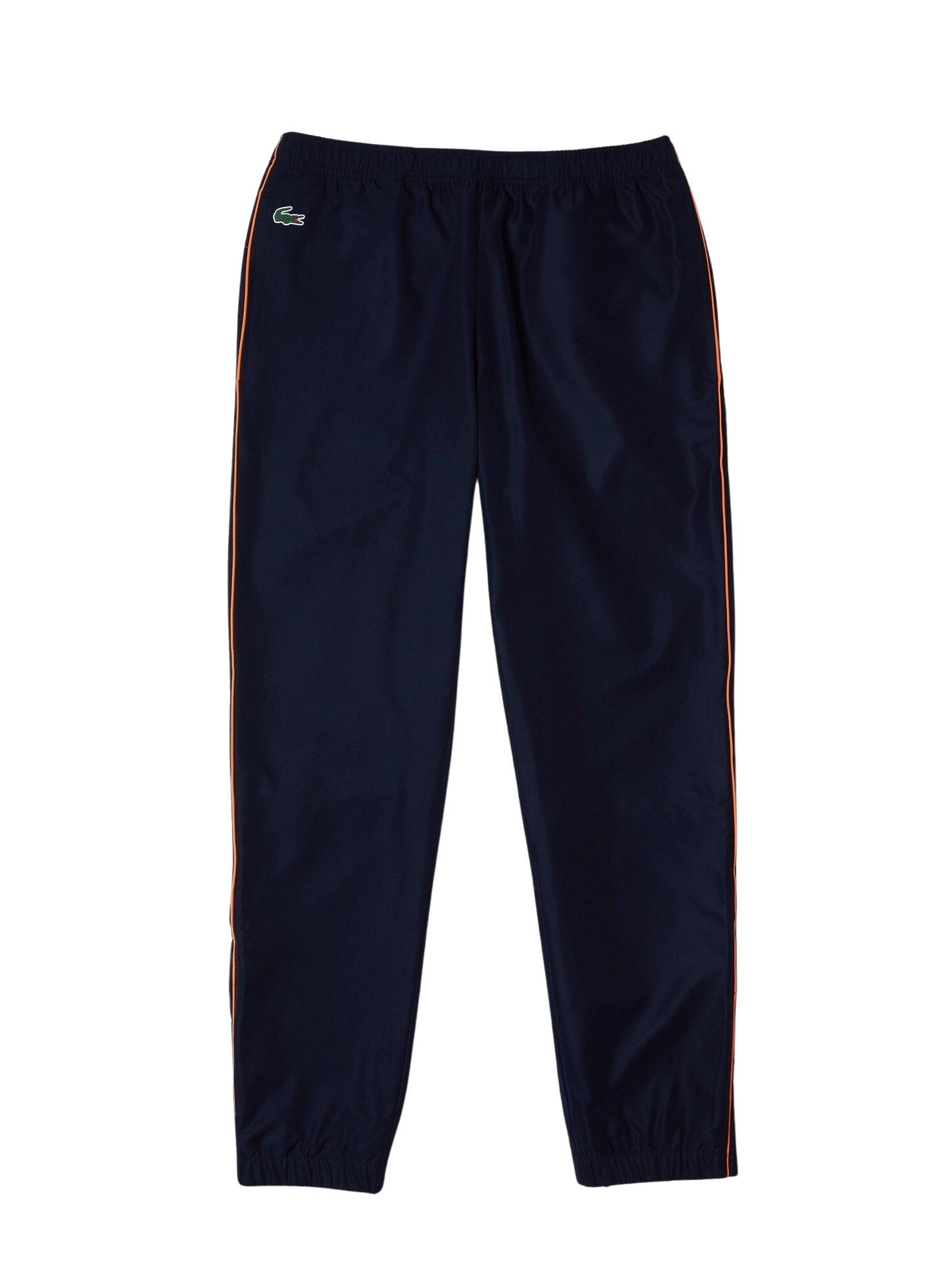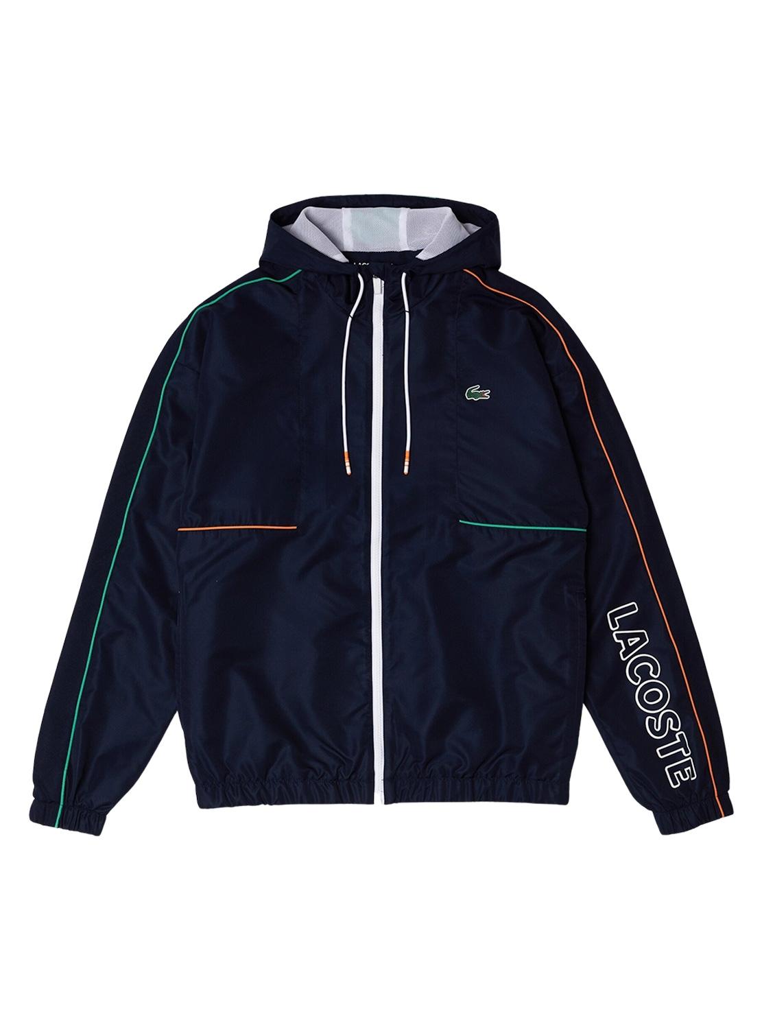 Treino Lacoste. Modelo Sport. Casaca na cor marinha. Fechamento em zíper branco. Detalhes com linhas coloridas. Logo estampado na manga. Costas em crocodilo, extremidades elásticas. Calças na marinha. Linhas laranja nas laterais.