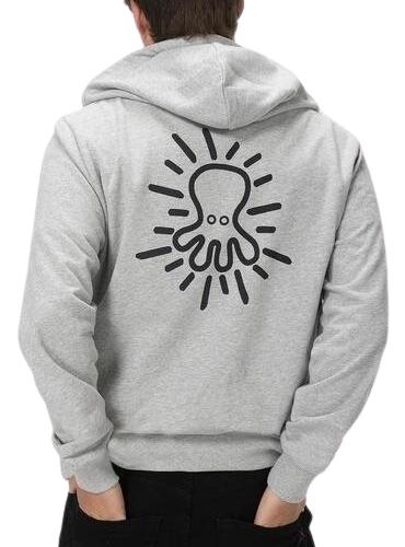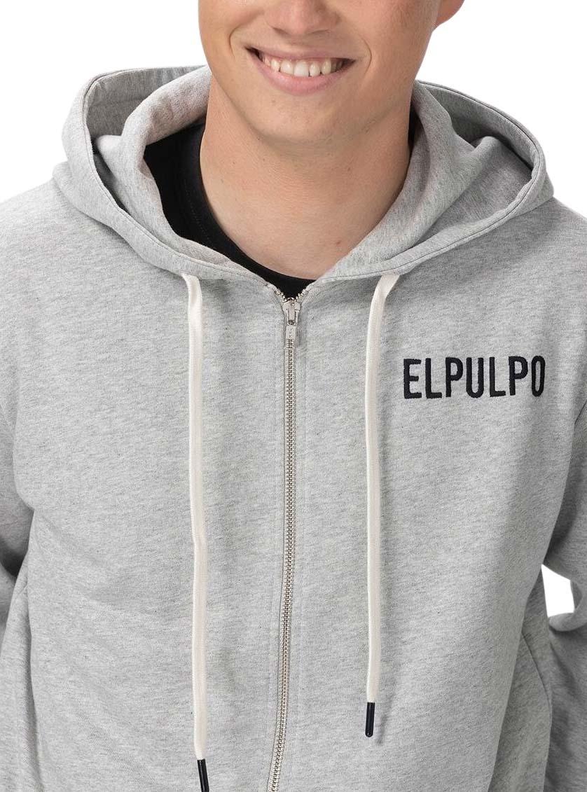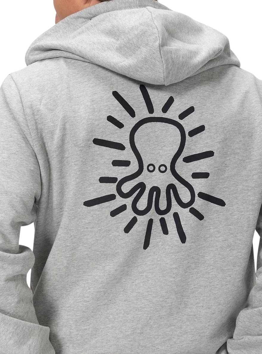 Casaca El Pulpo. Cor cinzenta. Estampa oversized nas costas. El Pulpo estampado no peito. Modelo Storm Zip. Com capuz e cordão ajustável. Bolsos nas laterais. Punhos e barra canelados. Detalhe cruzado bordado na manga.