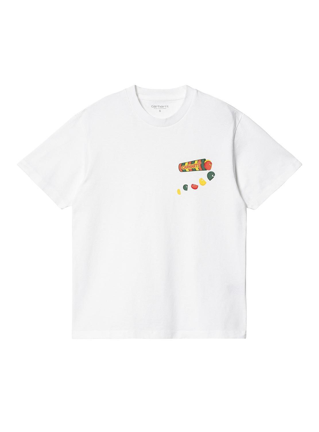 T-Shirt Carhartt. Modelo Frol. Cor branca. Pescoço redondo. Manga curto. Ajuste quadrado Ilustração impressa a cores no peito.