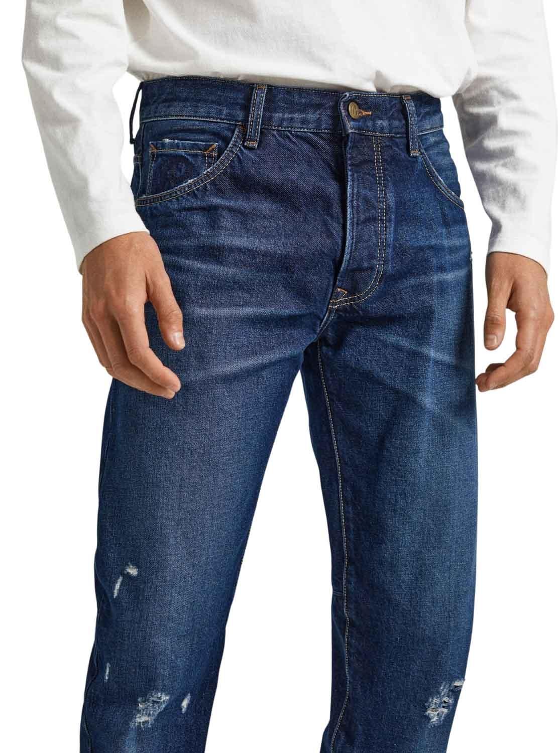 Jeans Calças Pepe Jeans. Modelo Easton Desgastado. Cor azul escuro. Fechamento por botão e zíper. Presilhas para cinto para. Detalhes quebrados. Etiqueta de couro na cintura. 5 Bolsos.