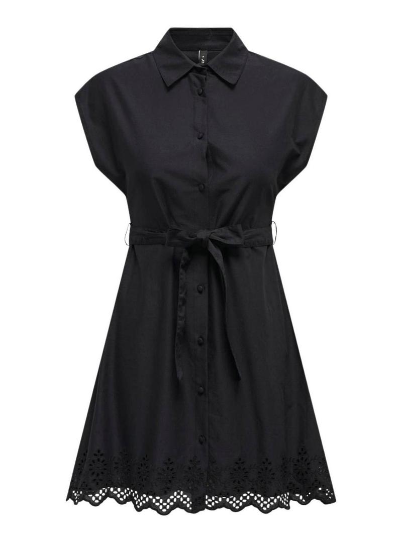 Vestido Only. Cor preta. Colarinho de camisa. Manga curta. Frente com botões. Barra com bordados. Formato curto. Laço na cintura. O modelo veste o tamanho S.