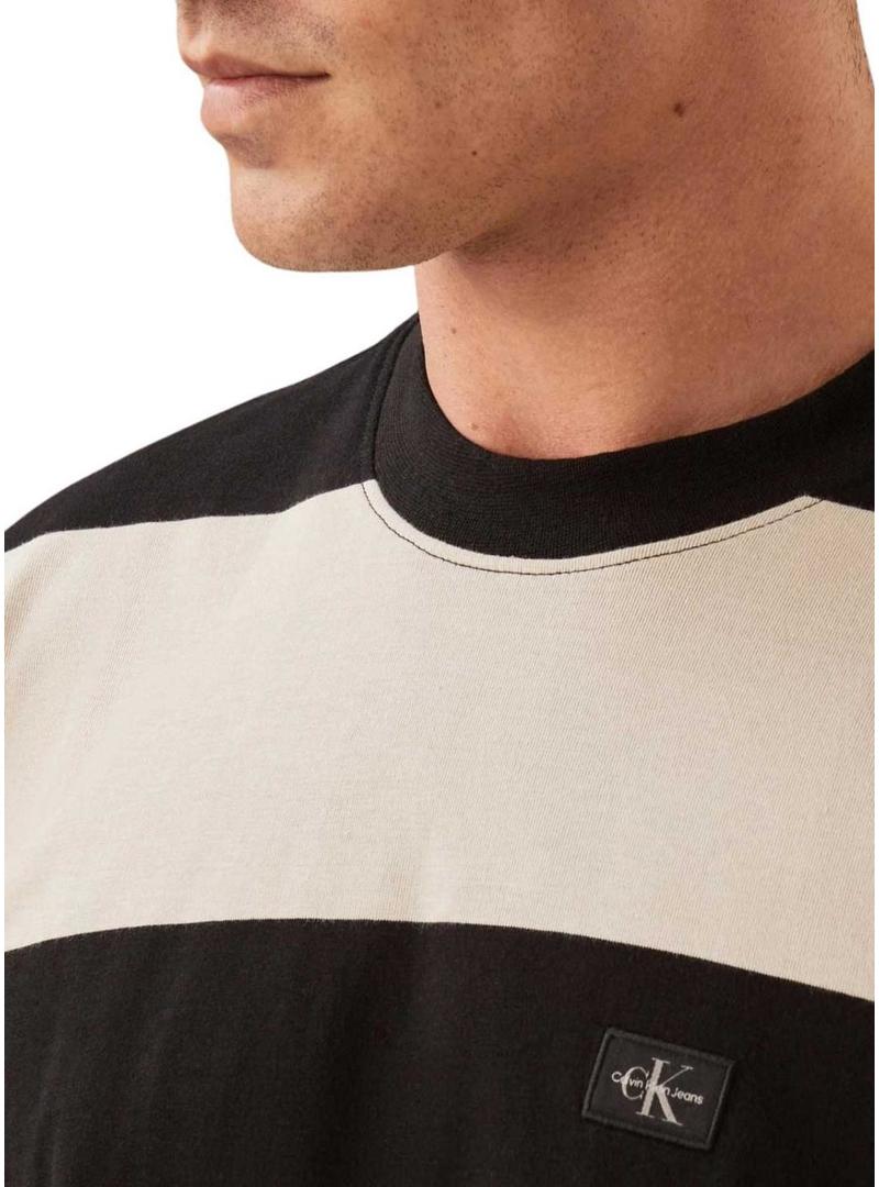 Camiseta Calvin Klein Monólogo listrado preto estampado para homem.