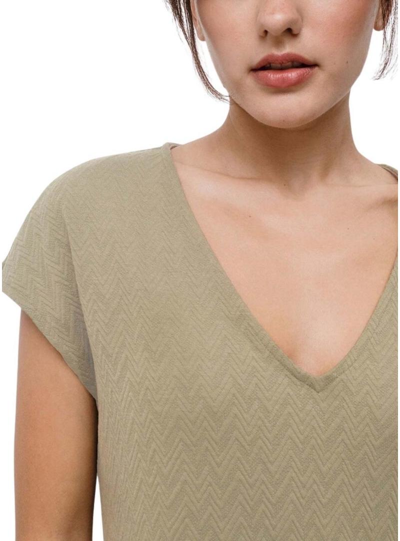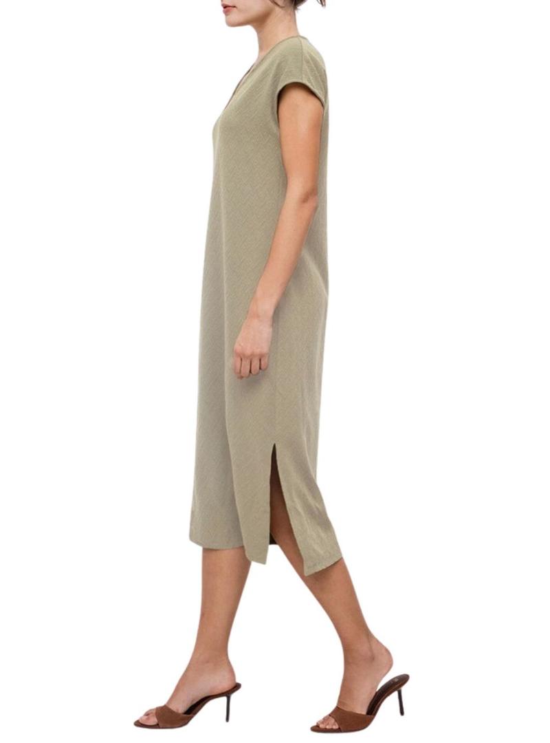 Vestido Vila. Gola em V. Cor bege. Sem mangas. Ombros caídos. Corte folgado. Comprimento midi. Estampado no tecido.