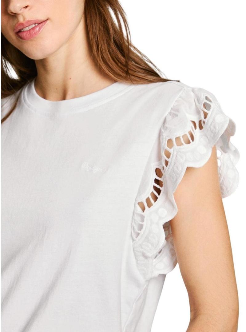 Camiseta Pepe Jeans. Modelo Vic. Cor branca. Gola redonda. Logotipo bordado no peito. Tecido com efeito de lavagem. Ajuste regular. Manga com babados e recortes.