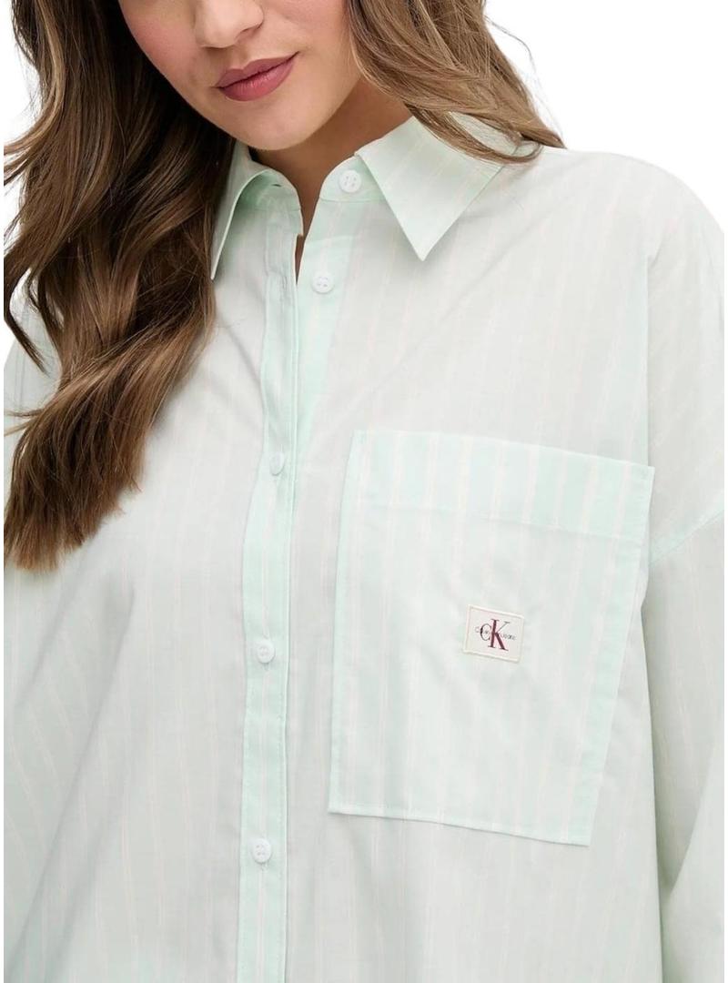 Camisa Calvin Klein Jeans. Modelo Summer Poplin. Cor turquesa. Estampado com listras verticais em branco. Ajuste folgado. Fechamento com botões. Bolso no peito com emblema da marca bordado.