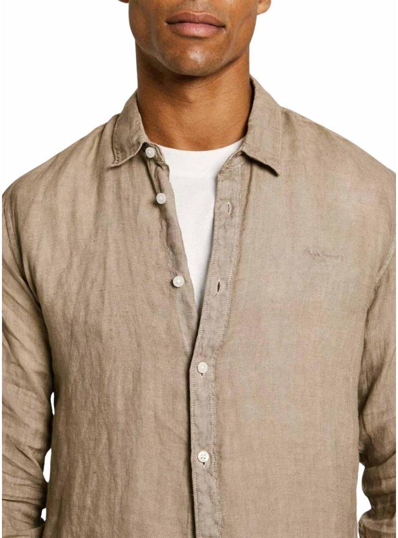 Camisa Pepe Jeans. Modelo Arnau. Cor verde. Corte regular. Logotipo bordado no peito. Fecho com botões. Barra arredondada. Botões ajustáveis nos punhos. Tecido de algodão e linho.