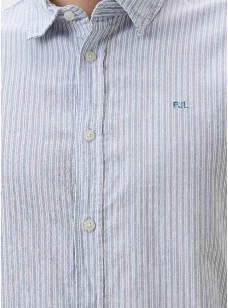 Camisa Pepe Jeans. Modelo Alvin. Estampado às riscas. Cor azul e branco. Logotipo bordado no peito. Botões de fecho. Punhos ajustáveis. Bainha arredondada. Ajuste regular.