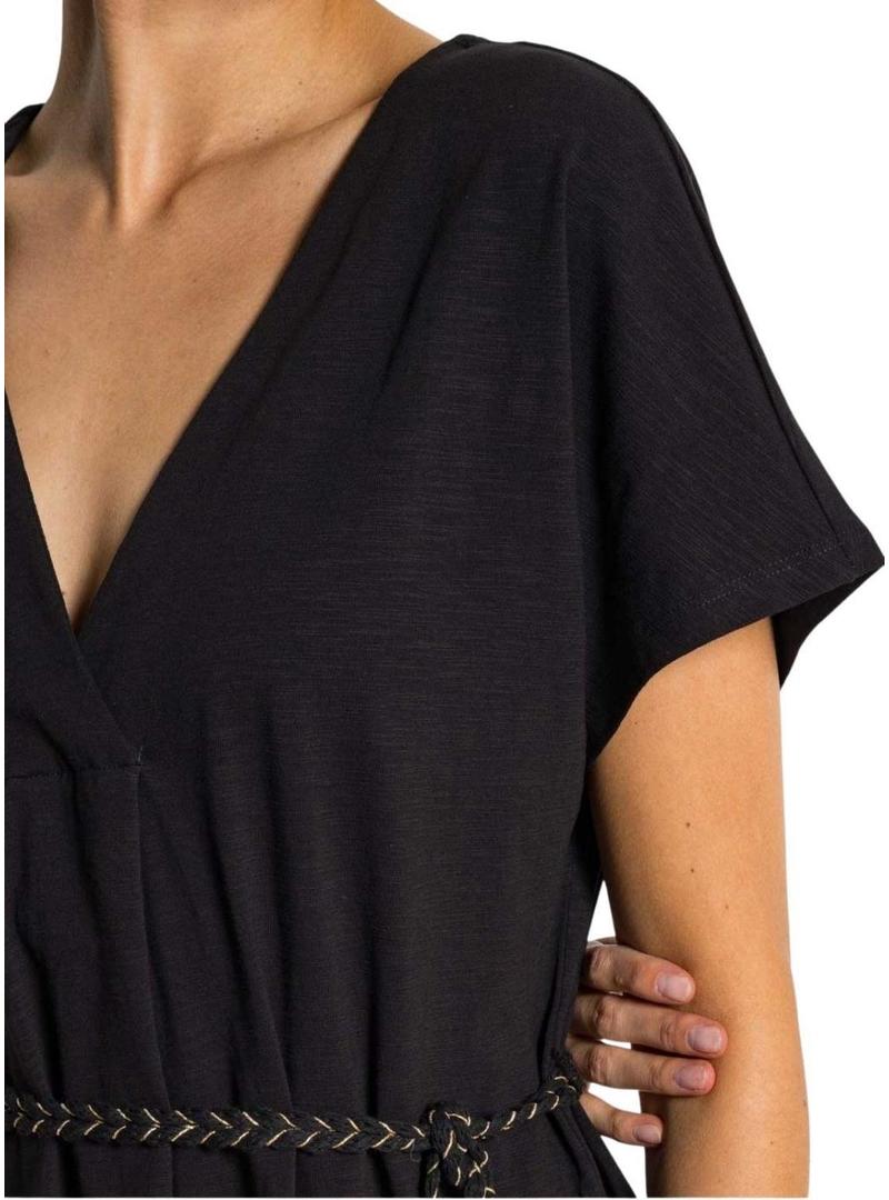 Vestido Vila. Cor preta. Manga curta. Ombros caídos. Decote em V. Com cinto trançado. Comprimento midi. Abertura lateral. Corte folgado.