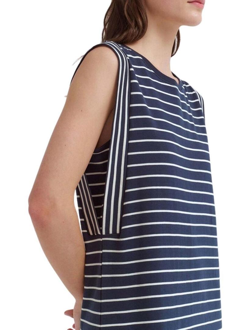 Vestido Vila. Estampado de riscas em azul marinho. Comprimento midi. Gola redonda. Sem mangas. Corte regular. Tecido macio de algodão.