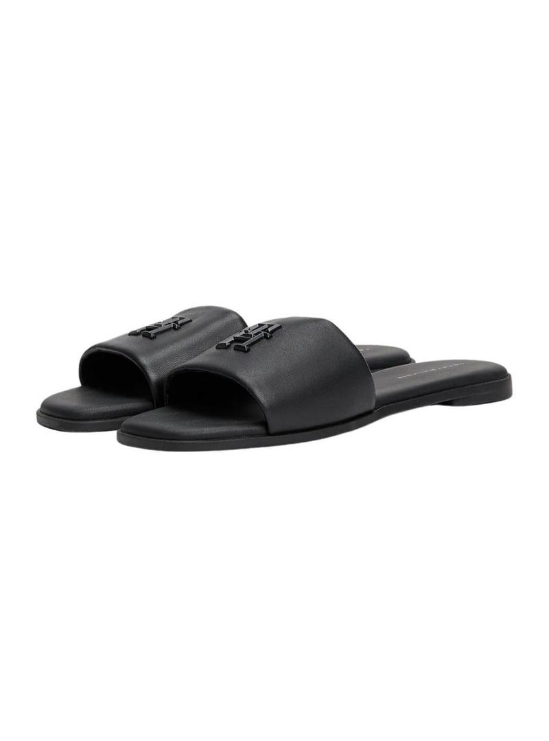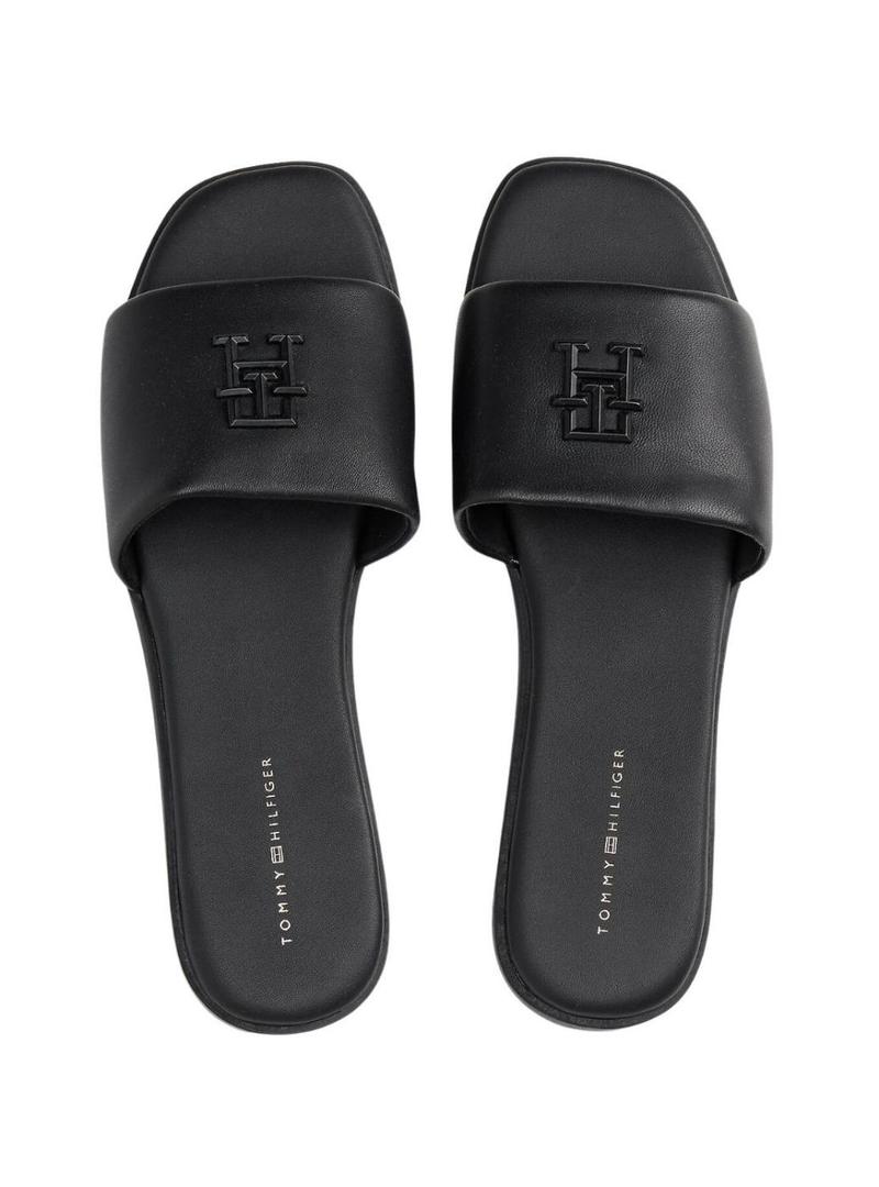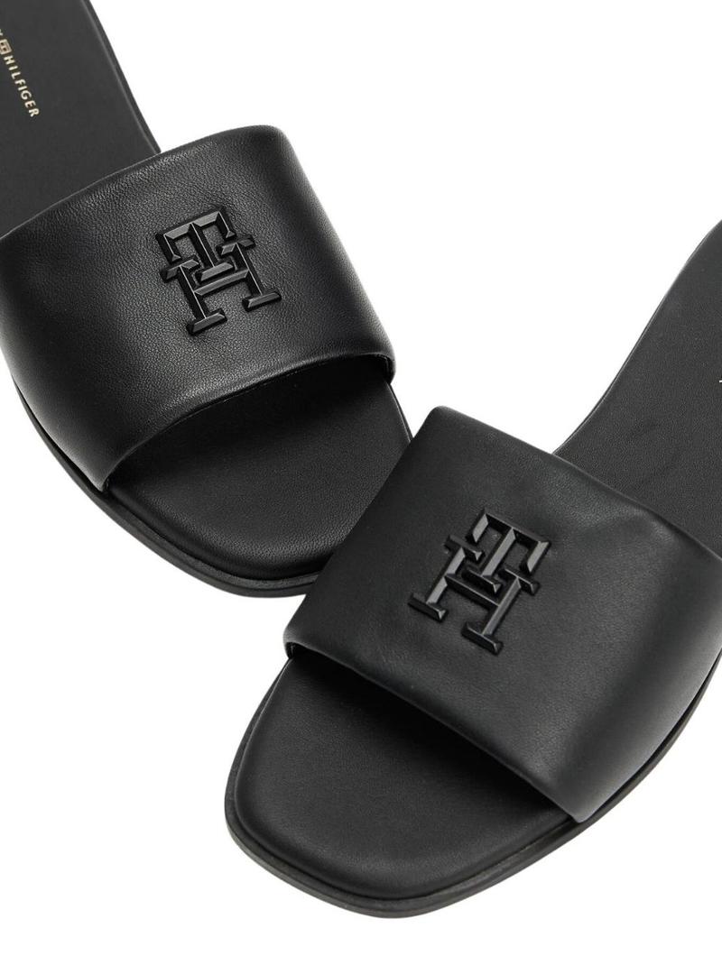 Sandálias Tommy Hilfiger. Modelo Logo. Cor preta. Logo metálico do mesmo tom. Tira superior de couro acolchoado e macio. Sola extra plana. Estilo slide.