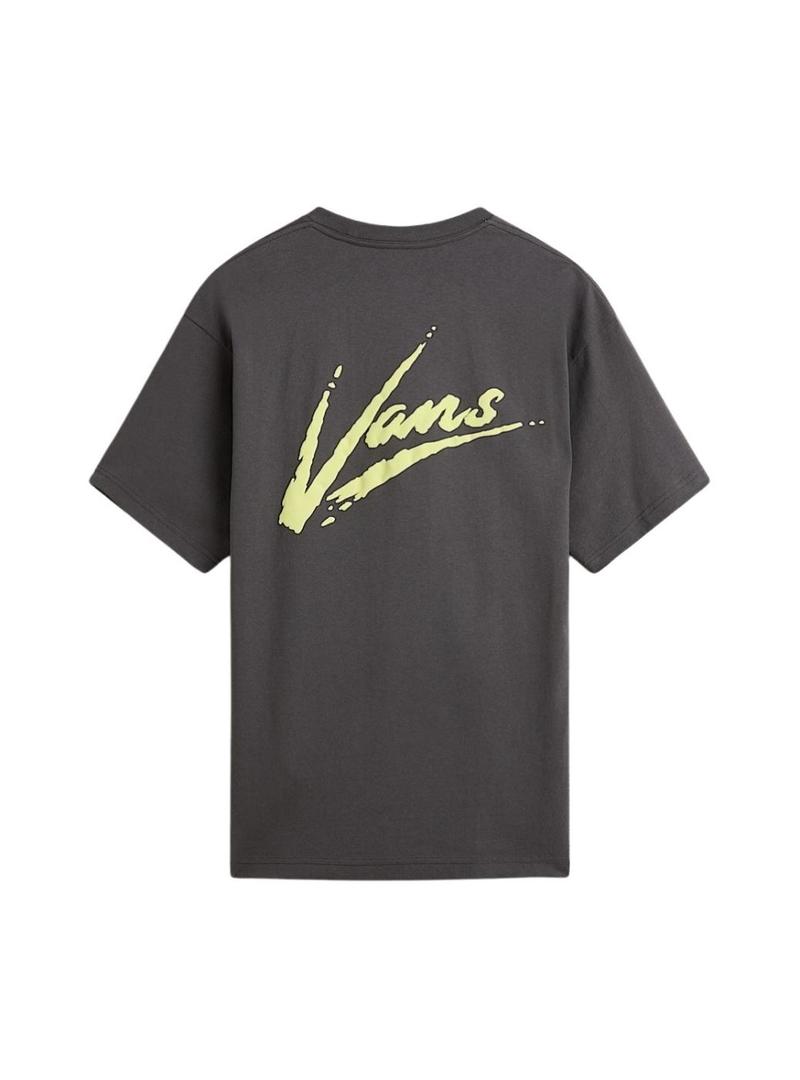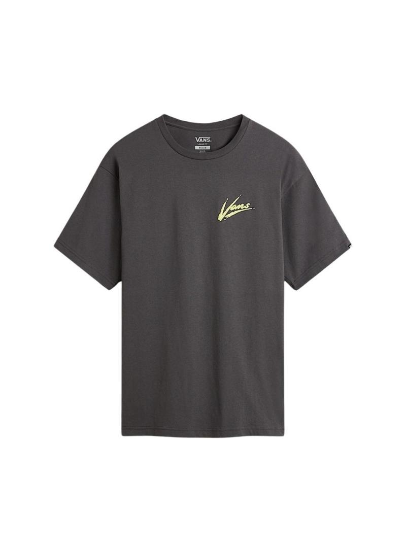 Camiseta Vans. Modelo Dettori. Cor antracita. Ajuste folgado. Manga curta. Gola redonda. Logotipo estampado no peito e nas costas. Detalhes em cor limão.