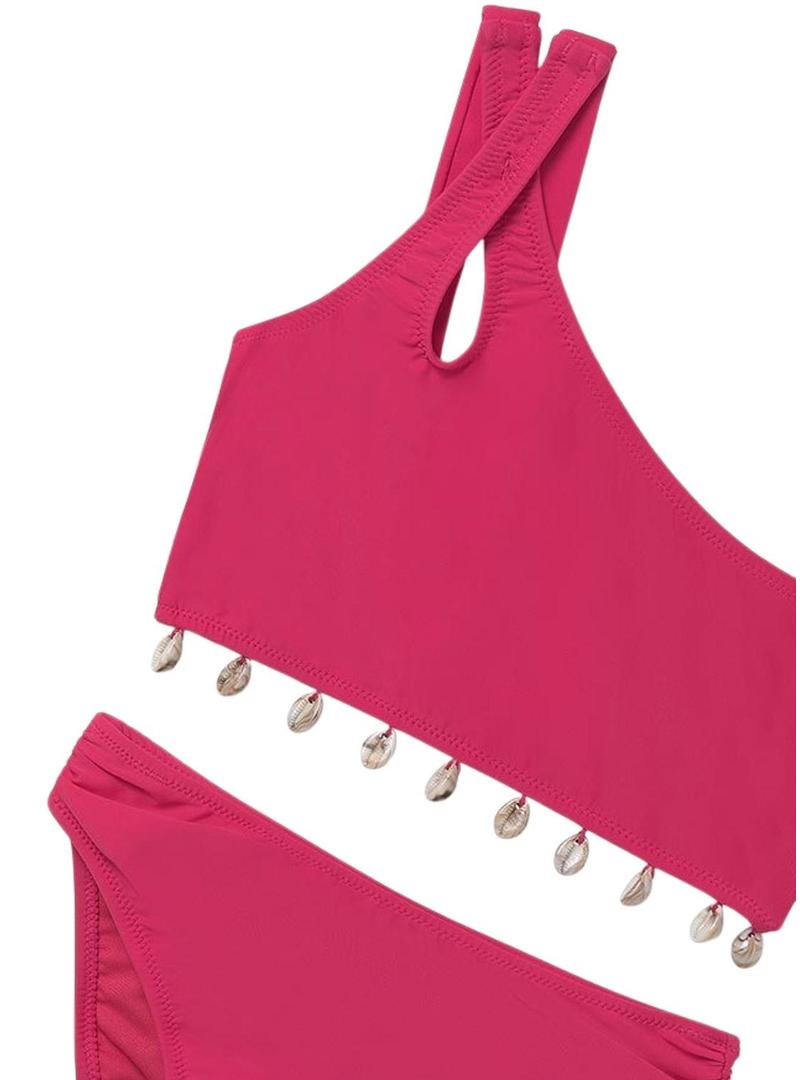 Biquíni Mayoral. Cor framboesa. Top assimétrico. Tecido com brilho. Conchas decorativas na parte inferior do top.