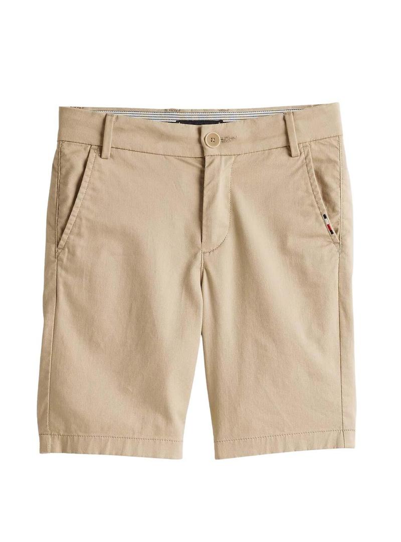 Bermudas Tommy Hilfiger. Modelo 1985. Cor bege. Estilo chinês. Fecho com botão e zíper. Bolsos laterais. Bolsos com botão. Logotipo bordado. Tecido ligeiramente elástico. Para criança.