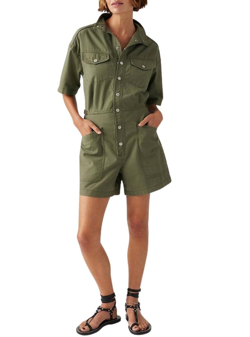 Jumpsuit Levis . Cor verde. Curto. Corte folgado. Bolsos no peito com aba. Bolsos nos quadris. Bolsos traseiros. Manga curta com dobra. Ombros caídos. Gola camisa. Fechamento frontal com botões. Ajustável na cintura com presilhas.