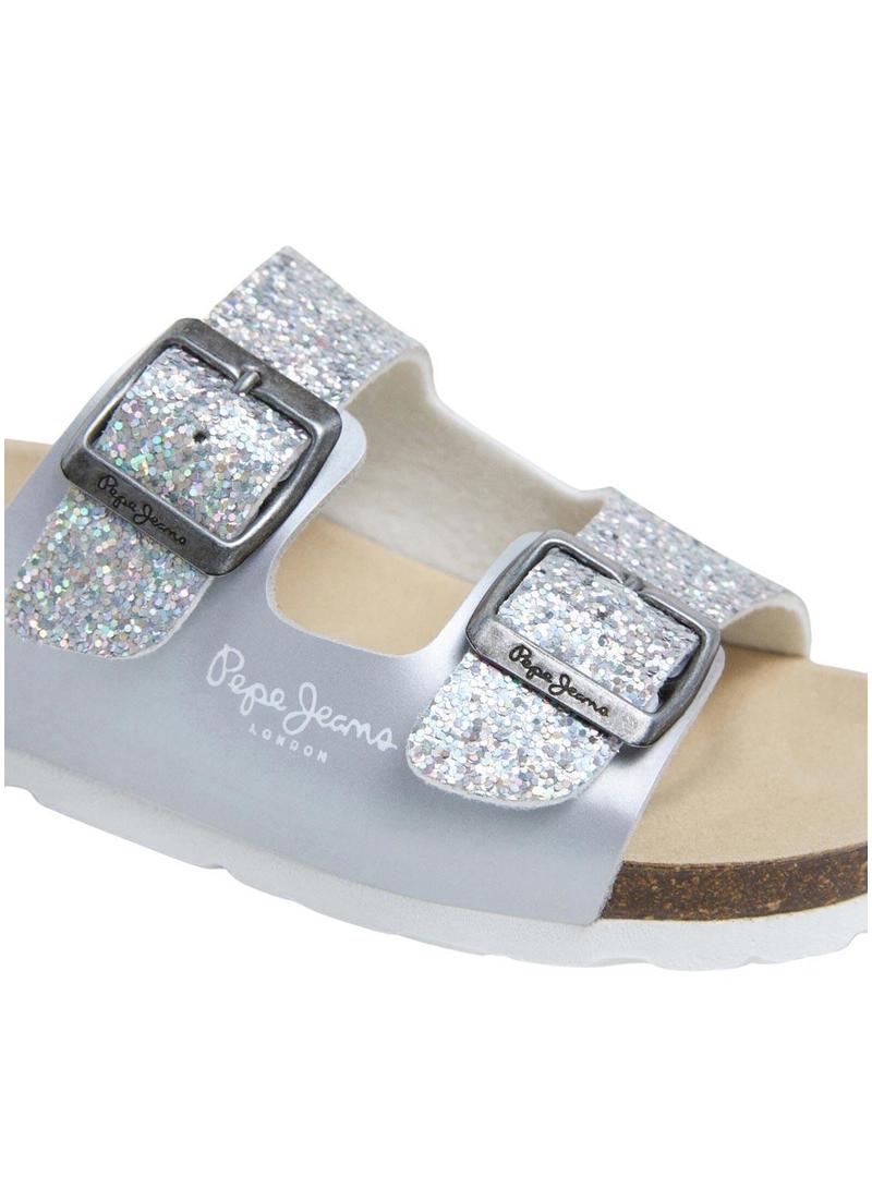 Sandálias Pepe Jeans. Modelo Oban. Cor prateada. Fivelas metálicas. Fitas com detalhes em glitter. Sola de borracha. Palmilha de cortiça com formato anatômico.
