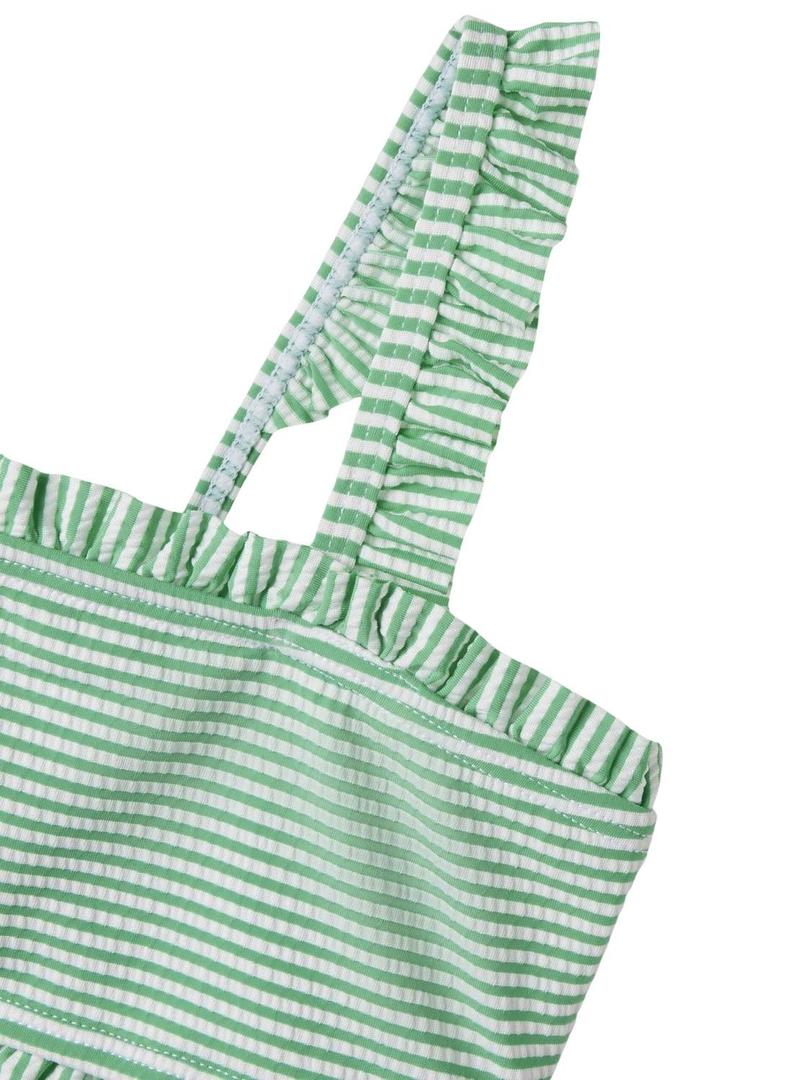 Biquíni Name It. Modelo Zaid. Listras estampadas. Cor branca e verde. Babados nas mangas. Conjunto de biquíni. Forro de malha de poliéster. Interior de poliamida e elastano. Entretela de poliamida.
