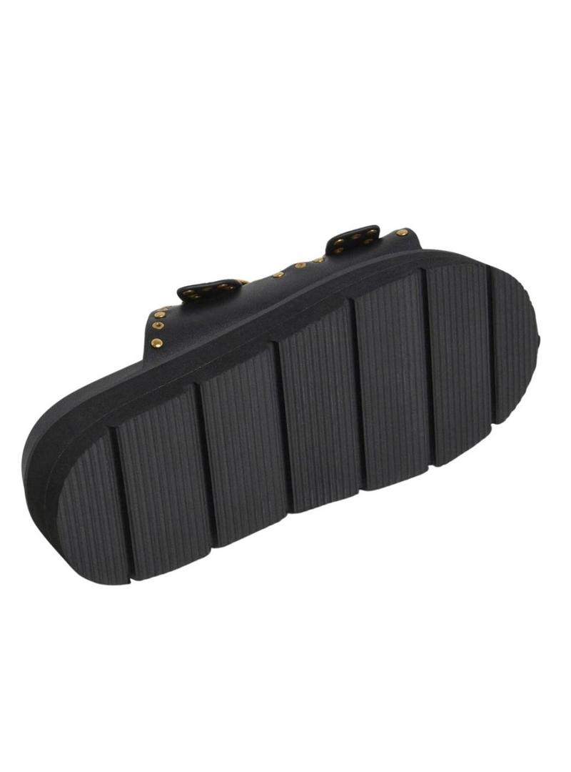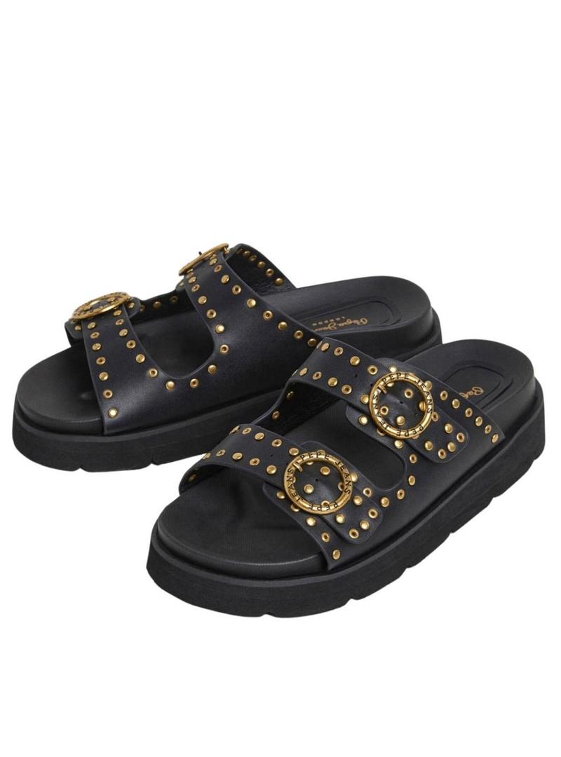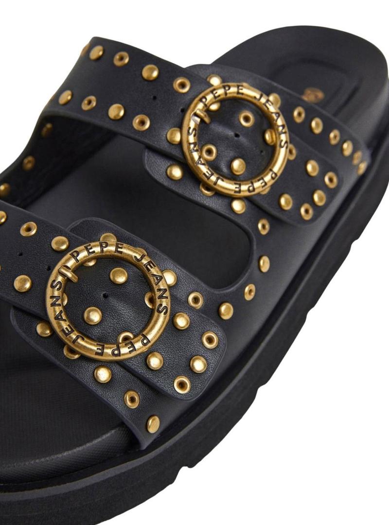Sandálias Pepe Jeans. Modelo Pola. Cor preto. Sola de EVA com padrão antiderrapante. Tiras com fecho de dupla fivela no peito do pé. Fivelas metálicas com logotipo gravado. Tachas em dourado. Palmilha anatómica.
