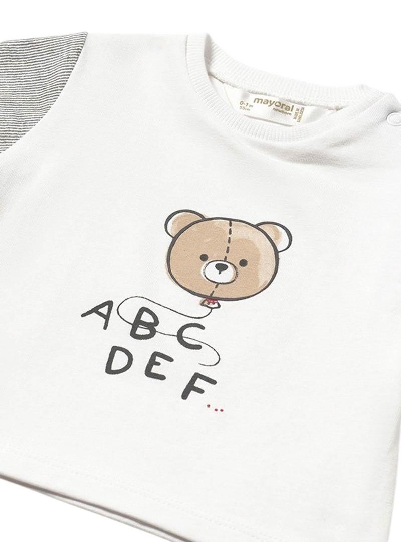 Camisa Mayoral. Modelo Urso. Cor branca. Manga curta. Gola redonda. Estampado no peito. Fecho com botão de pressão. Para recém-nascido. Tecido suave de algodão. Detalhe em relevo.
