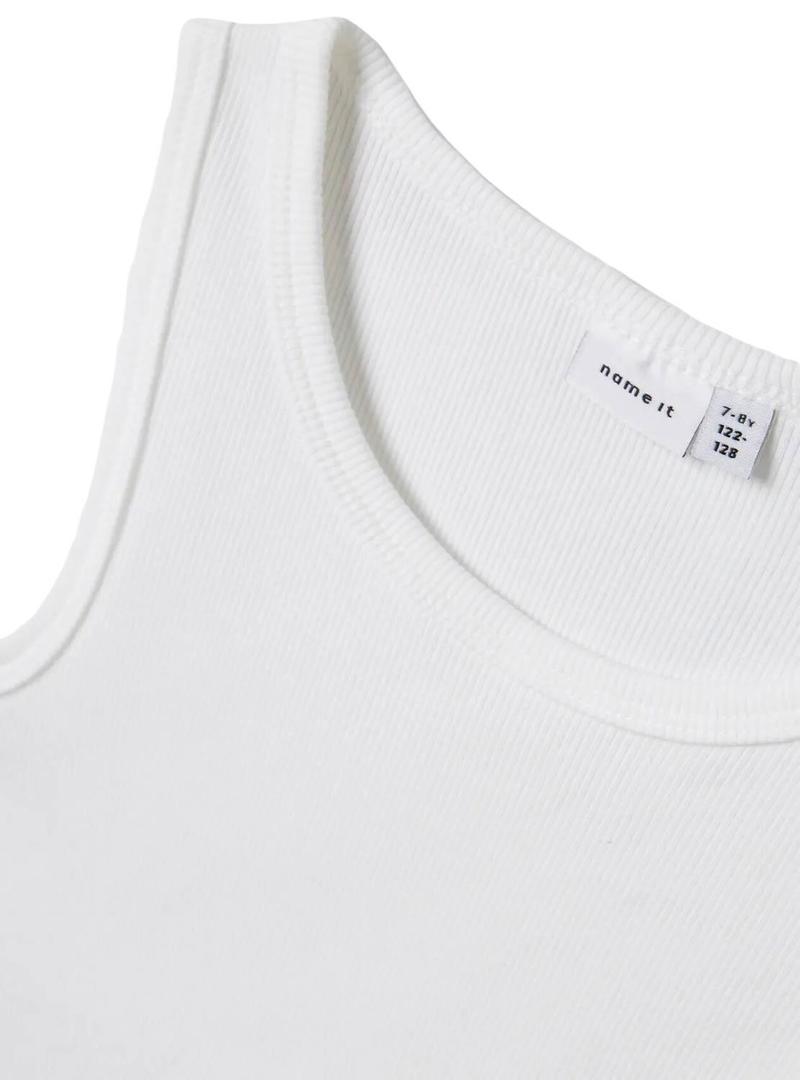 Camisa Name It. Modelo Holutti. Cor branca. Gola redonda elástica. Aberturas laterais. Sem mangas. Recortes.