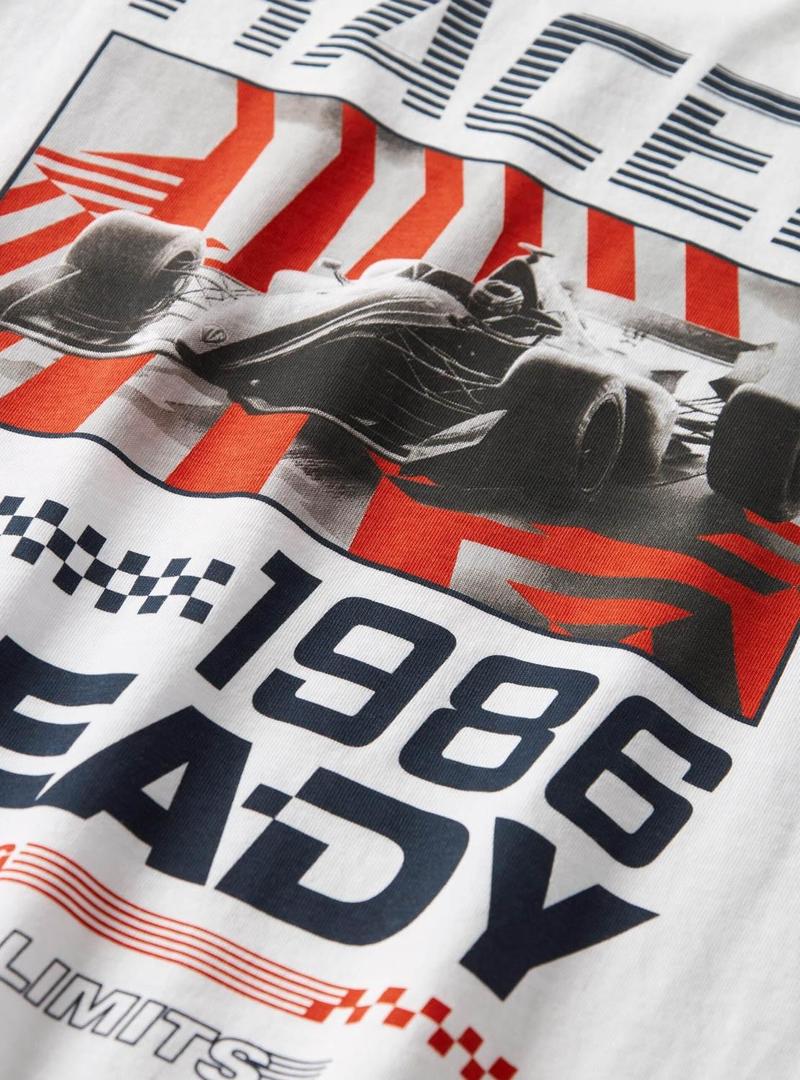 Camiseta Name It. Modelo Hold. Cor branca. Gola redonda elástica. Manga curta. Estampa nas costas inspirada em corridas. Ombros caídos. Ajuste regular.
