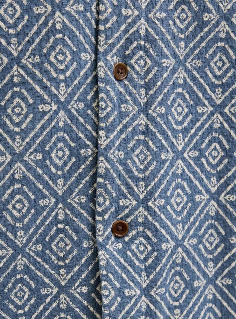 Camisa Jack and Jones. Modelo Vicent. Cor azul. Estampa geométrica em branco. Fechamento com botões. Manga curta. Ajuste folgado.