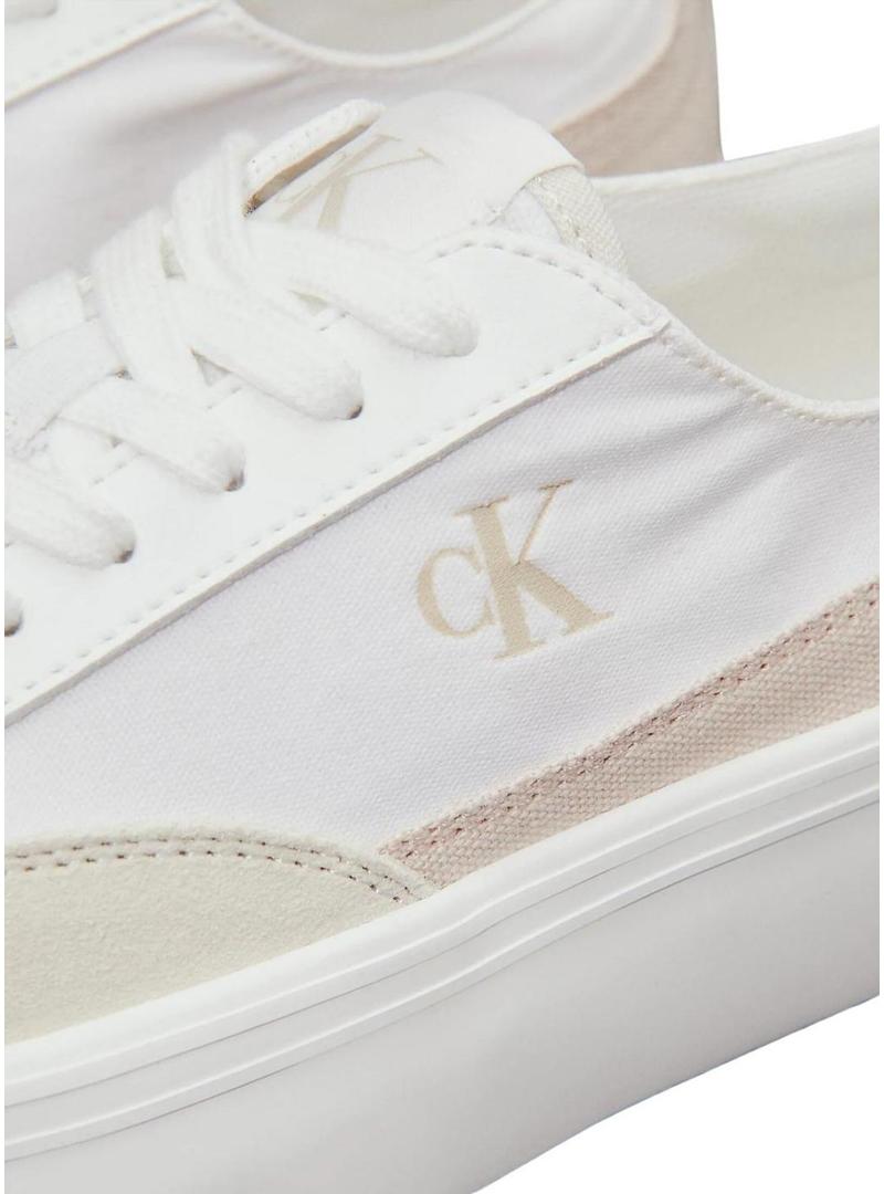 Sneakers Calvin Klein. Cor branca. Parte superior de lona com algodão reciclado. Acabamento em camurça bege. Interior acolchoado de espuma. Sola de borracha natural. Altura de 3 cm. Logotipos da Calvin Klein no calcanhar, lateral e parte superior.