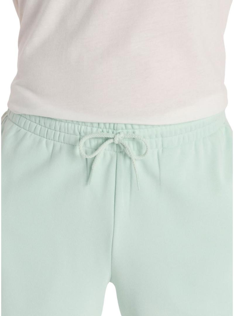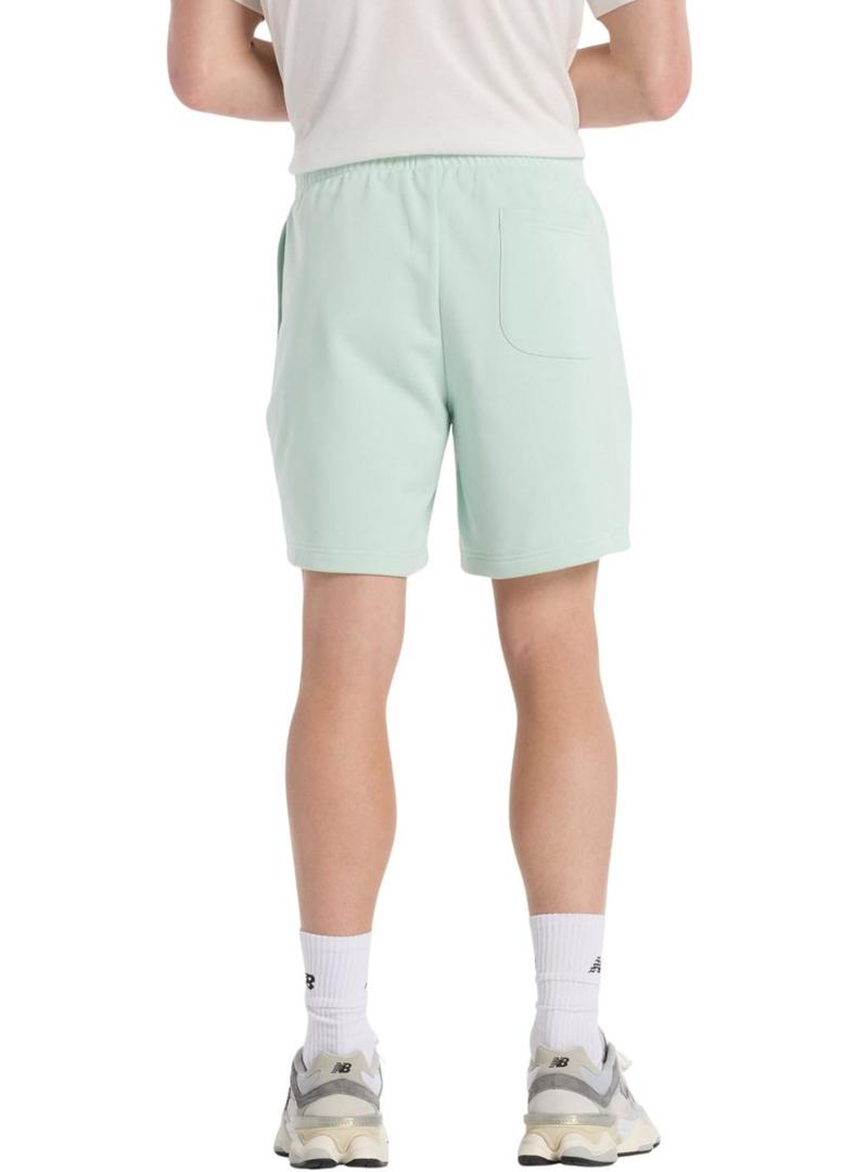 Bermuda New Balance. Tecido French Terry macio. Cor verde. Corte relaxado. Bolsos laterais. Um bolso traseiro. Logotipo bordado na parte da frente.