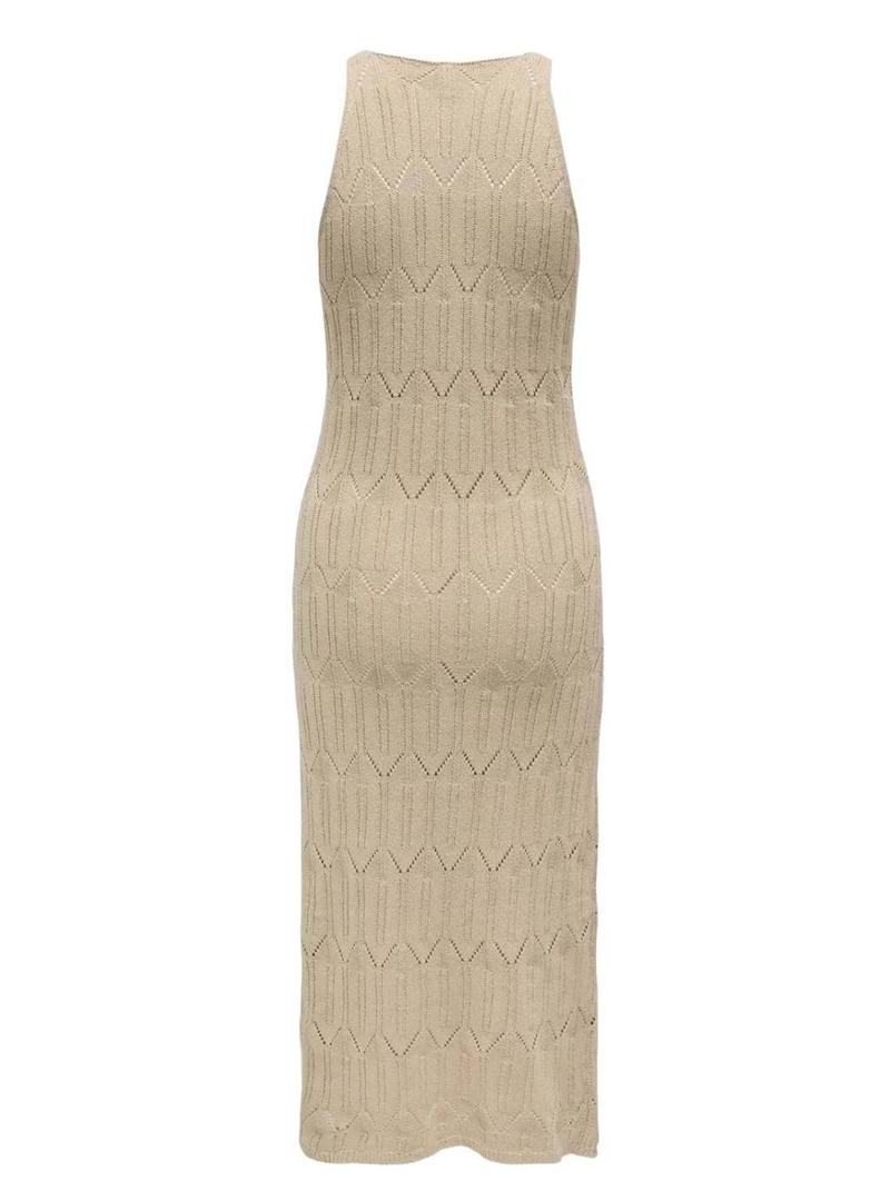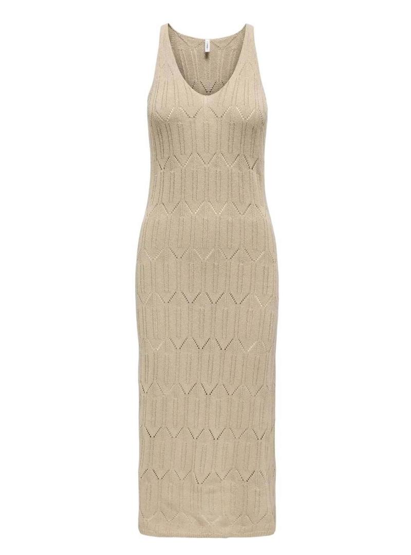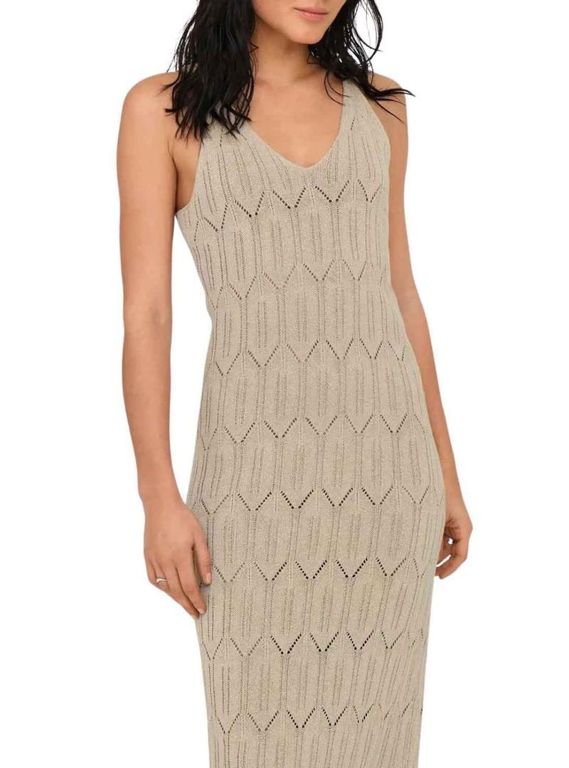 Vestido de malha Only. Modelo Mea. Cor bege. Decote em V. Sem mangas. Comprimento midi. Corte justo ao corpo. Lavar a máx. 30°C com programa suave. Levemente vazado.