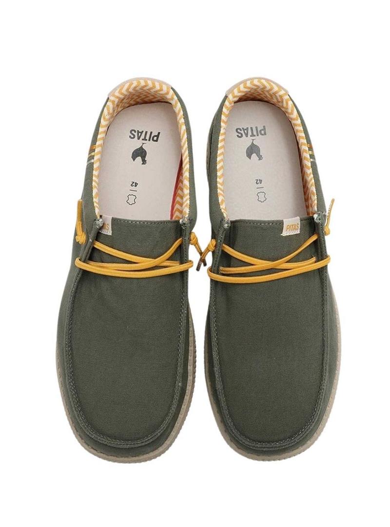 Sapatos Walkin Pitas. Modelo Wallabi. Cor verde. Parte superior em lona. Peça traseira em camurça. Cordões elásticos. Palmilha confortável de EVA e couro removível. Muito leves, 150 gramas de peso.