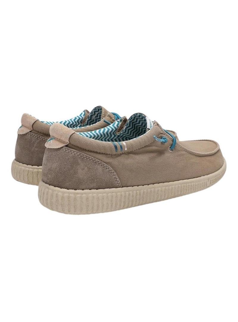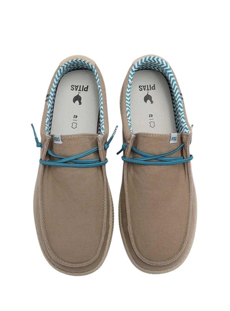 Sapatos Walkin Pitas. Modelo Wallabi. Cor topo. Parte superior de lona. Peça traseira em camurça. Cadarços elásticos em azul. Palmilha confortável de EVA e couro removível. Muito leves, 150 gramas de peso.