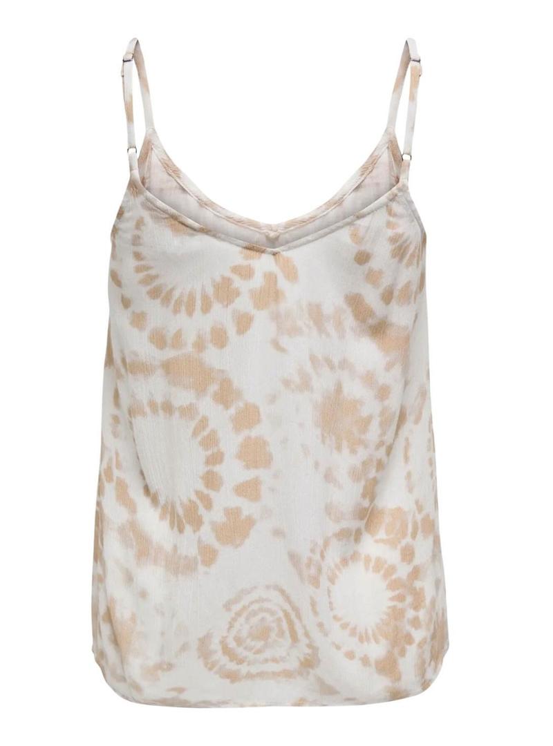 Top Only . Modelo Chiara. Cor bege. Estampa tie dye. Corte fluído. Sem mangas. Decote em V. Alças ajustáveis.