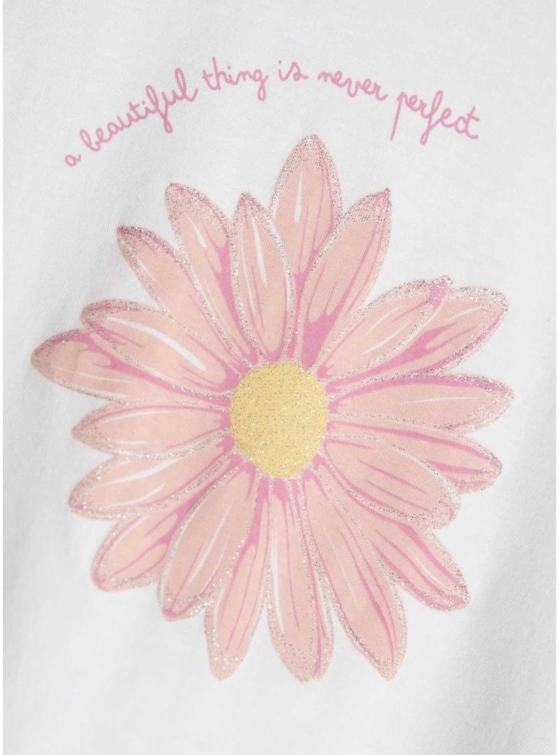 Camiseta Name It. Cor branca. Decote redondo. Manga curta. Flor estampada na frente. Formato regular.