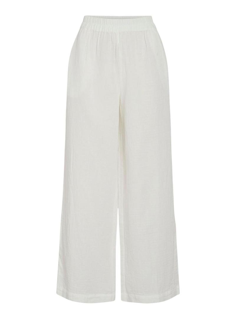 Calças Vila. Cor branca. Tecido leve. Cintura elástica. Cintura alta. Bolsos laterais. Pernas largas. O modelo veste tamanho 36.