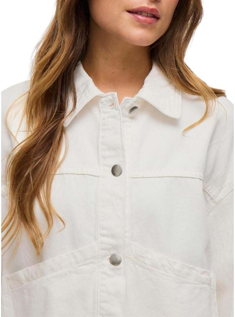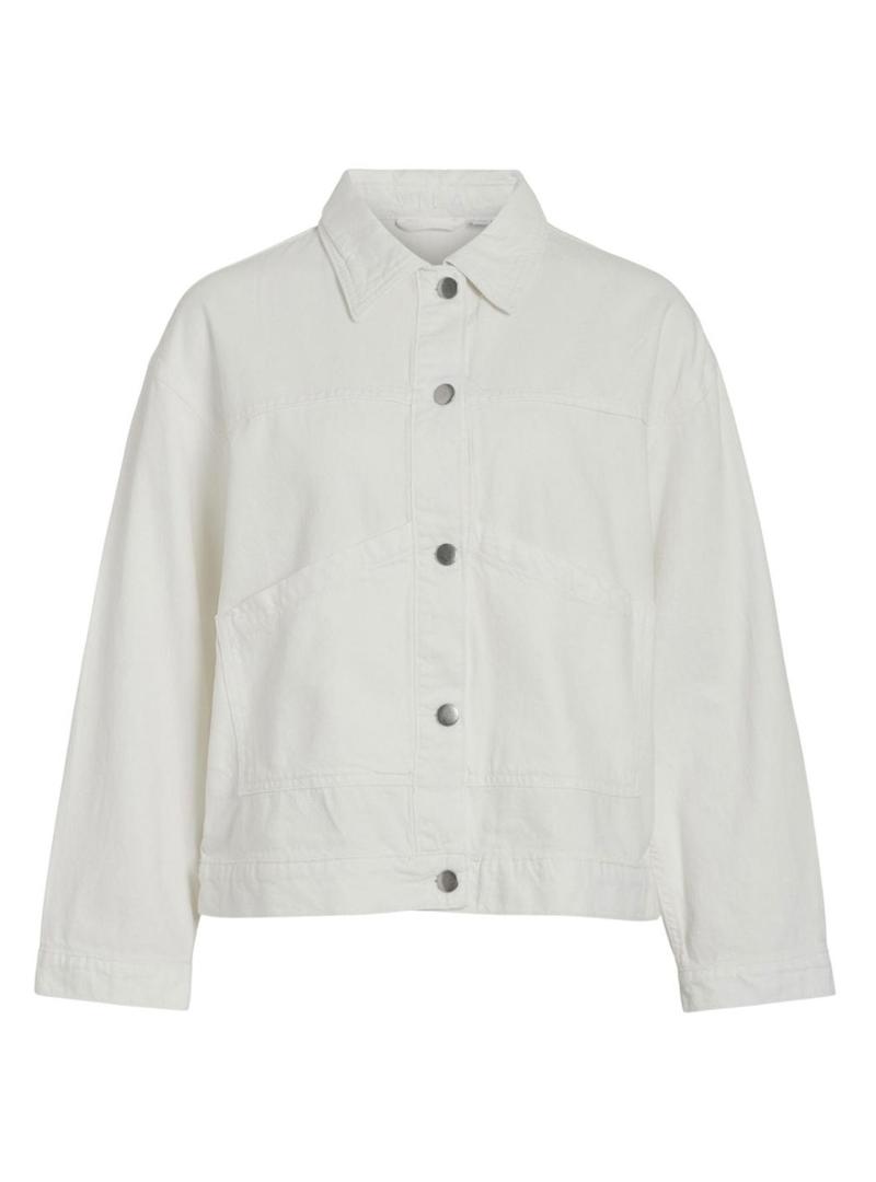 Jaqueta jeans da marca Vila. Cor branca. Gola clássica. Manga comprida. Fecho frontal com botões de pressão. Corte largo. Ombros caídos. Bolsos frontais.